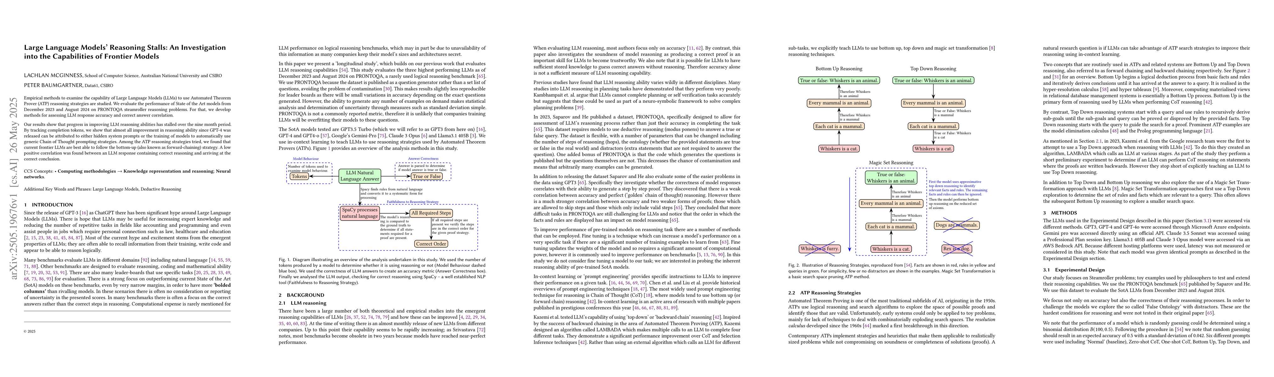 Large Language Models' reasoning abilities have stalled since GPT-4's release, with improvements attributed to hidden prompts and Chain of Thought strategies. Current models perform best on bottom-up (forward-chaining) reasoning strategies, but accuracy correlations are low.