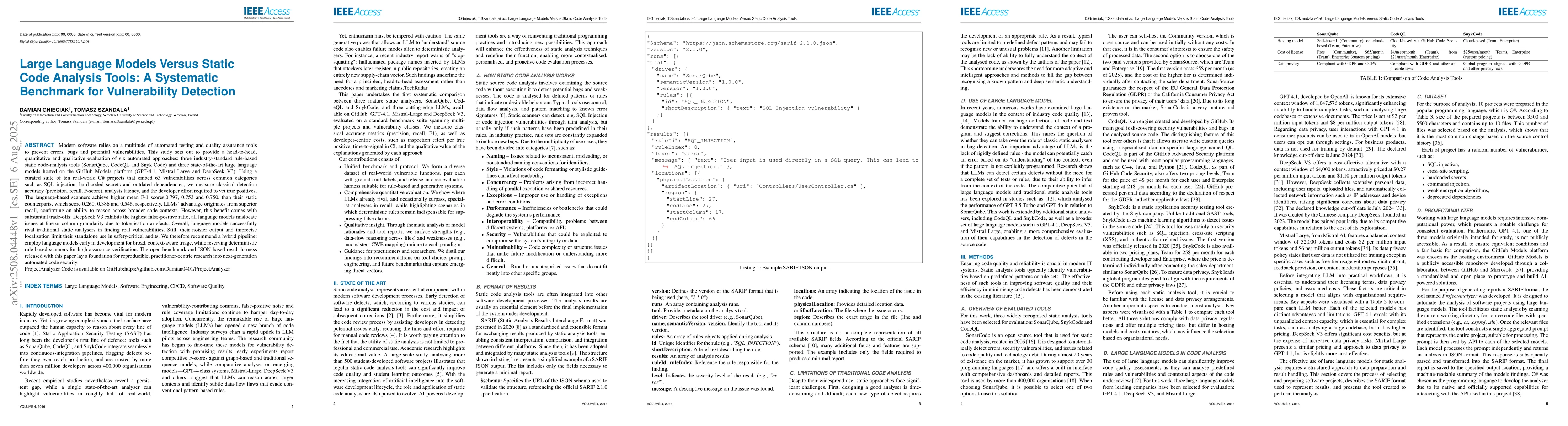 Modern software relies on a multitude of automated testing and quality assurance tools to prevent errors, bugs and potential vulnerabilities. This study sets out to provide a head-to-head, quantitative and qualitative evaluation of six automated approaches: three industry-standard rule-based static code-analysis tools (SonarQube, CodeQL and Snyk Code) and three state-of-the-art large language models hosted on the GitHub Models platform (GPT-4.1, Mistral Large and DeepSeek V3). Using a curated suite of ten real-world C# projects that embed 63 vulnerabilities across common categories such as SQL injection, hard-coded secrets and outdated dependencies, we measure classical detection accuracy (precision, recall, F-score), analysis latency, and the developer effort required to vet true positives. The language-based scanners achieve higher mean F-1 scores,0.797, 0.753 and 0.750, than their static counterparts, which score 0.260, 0.386 and 0.546, respectively. LLMs' advantage originates from superior recall, confirming an ability to reason across broader code contexts. However, this benefit comes with substantial trade-offs: DeepSeek V3 exhibits the highest false-positive ratio, all language models mislocate issues at line-or-column granularity due to tokenisation artefacts. Overall, language models successfully rival traditional static analysers in finding real vulnerabilities. Still, their noisier output and imprecise localisation limit their standalone use in safety-critical audits. We therefore recommend a hybrid pipeline: employ language models early in development for broad, context-aware triage, while reserving deterministic rule-based scanners for high-assurance verification. The open benchmark and JSON-based result harness released with this paper lay a foundation for reproducible, practitioner-centric research into next-generation automated code security.