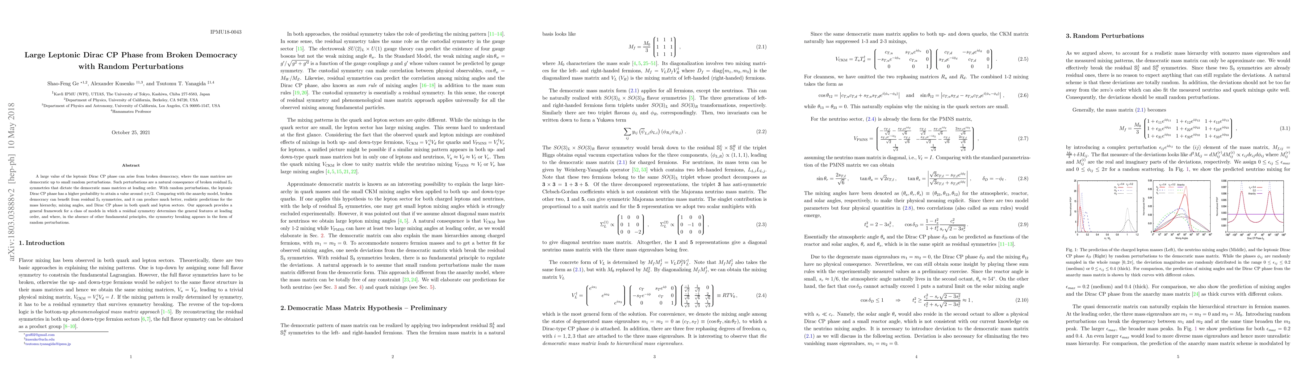This paper explores how a large leptonic Dirac CP phase can emerge from broken democracy due to small random perturbations in democratic mass matrices. It suggests that these perturbations, stemming from broken $\mathbb S_3$ symmetries, enhance the likelihood of the CP phase being around $\pm \pi/2$, offering more realistic predictions for mass hierarchies and mixing angles compared to the anarchy model.
