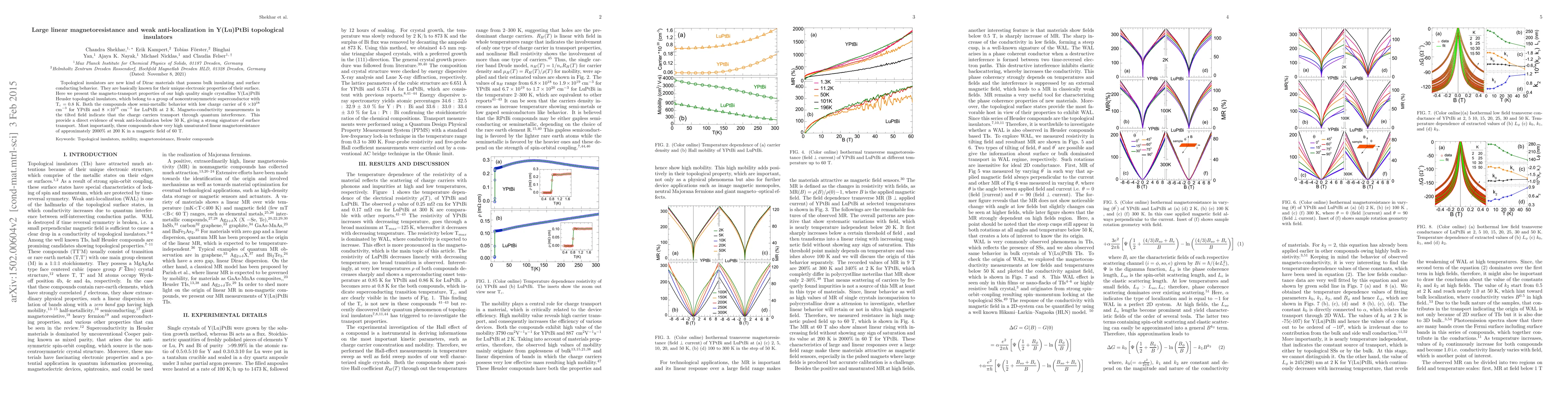 This paper investigates the magneto-transport properties of Y(Lu)PtBi Heusler topological insulators, revealing large linear magnetoresistance and weak anti-localization, indicative of quantum interference and surface conduction behavior in these semi-metallic materials.