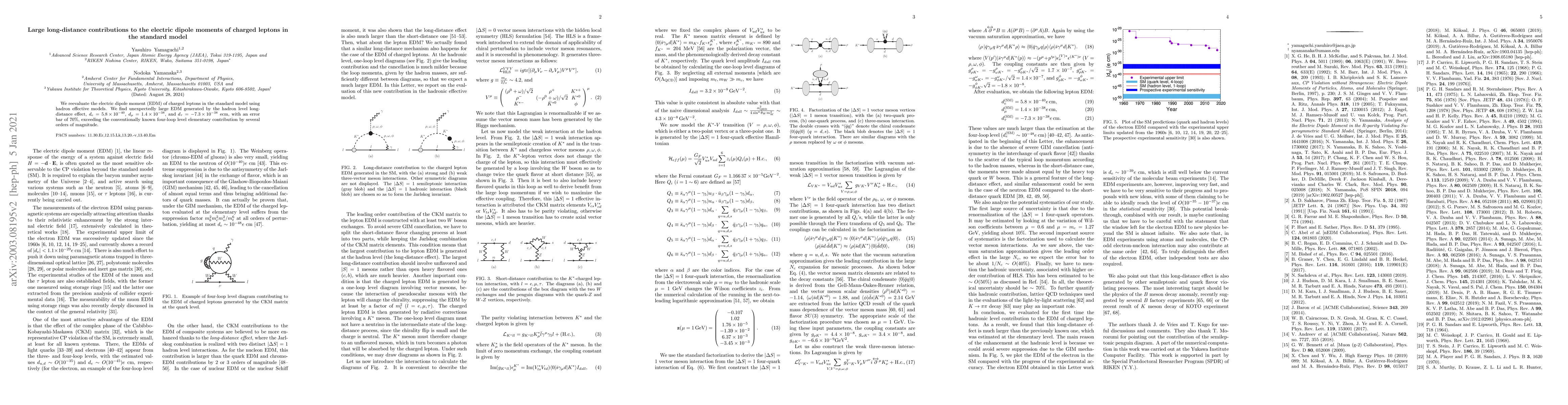 We reevaluate the electric dipole moment (EDM) of charged leptons in the standard model using hadron effective models. We find unexpectedly large EDM generated by the hadron level long-distance effect, $d_e = { 5.8 \times 10^{-40} }$, $d_\mu = { 1.4 \times 10^{-38}}$, and $d_\tau = { -7.3 \times 10^{-38} }$ ecm, with an error bar of 70\%, exceeding the conventionally known four-loop level elementary contribution by several orders of magnitude.