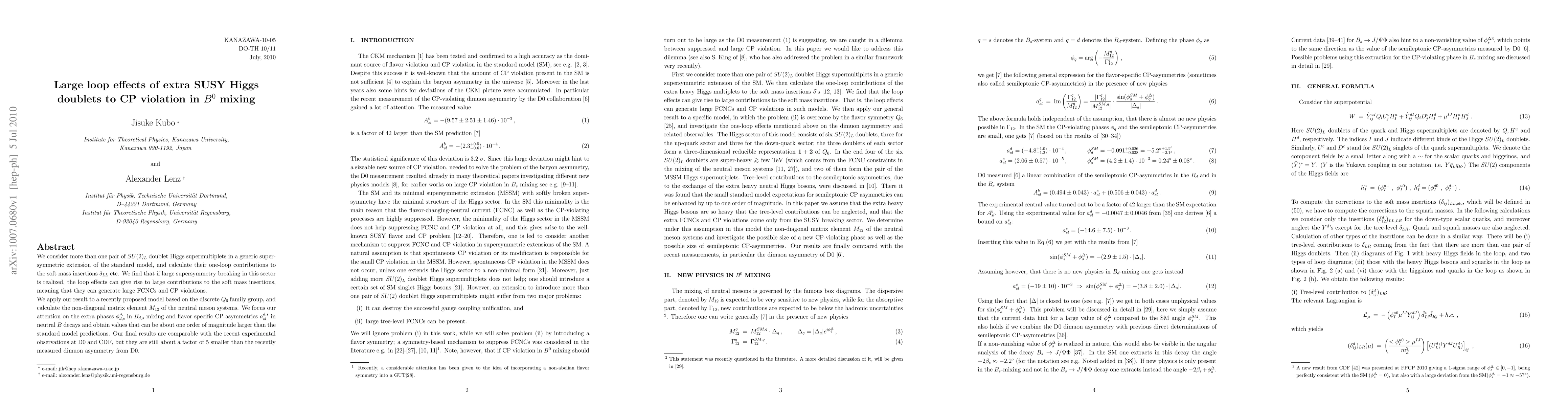 We consider more than one pair of SU(2)_L doublet Higgs supermultiplets in a generic supersymmetric extension of the standard model, and calculate their one-loop contributions to the soft mass insertions delta_{LL} etc. We find that if large supersymmetry breaking in this sector is realized, the loop effects can give rise to large contributions to the soft mass insertions, meaning that they We apply our result to a recently proposed model based on the discrete Q_6 family group, and calculate the non-diagonal matrix element M_{12} of the neutral meson systems. We focus our attention on the extra phases phi_{d,s}^Delta in B_{d,s}-mixing and flavor-specific CP-asymmetries a_{sl}^{d,s} in neutral B decays and obtain values that can be about one order of magnitude larger than the standard model predictions. Our final results are comparable with the recent experimental observations at D0 and CDF, but they are still about a factor of 5 smaller than the recently measured dimuon asymmetry from D0.