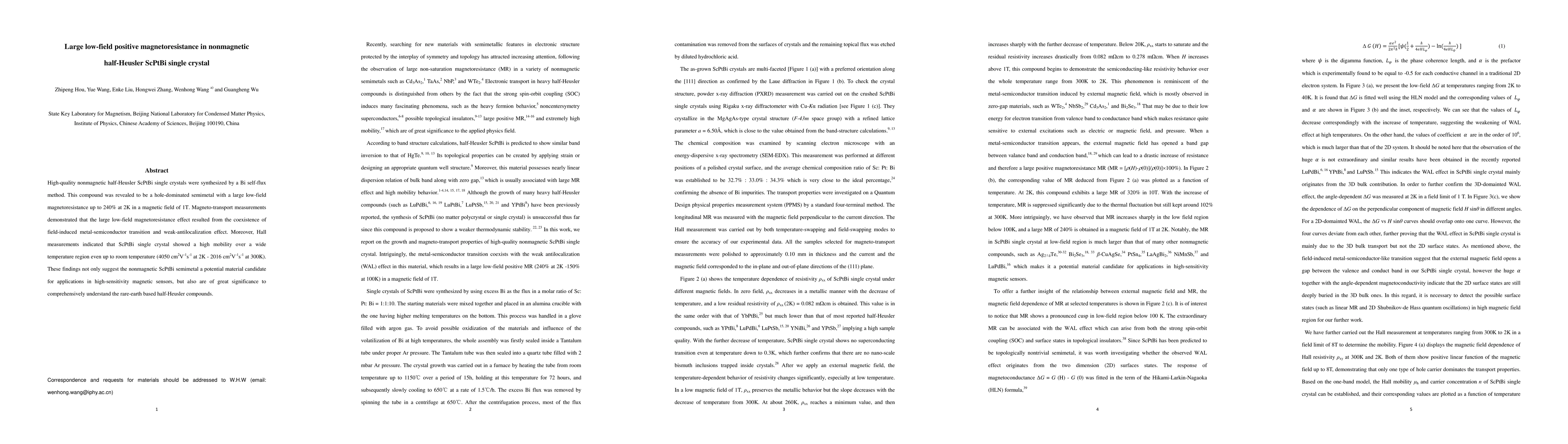 This study synthesizes high-quality ScPtBi single crystals, revealing large low-field magnetoresistance up to 240% at 2K, attributed to a metal-semiconductor transition and weak-antilocalization. The material exhibits high mobility over a wide temperature range, suggesting potential for high-sensitivity magnetic sensors and advancing understanding of rare-earth based half-Heusler compounds.