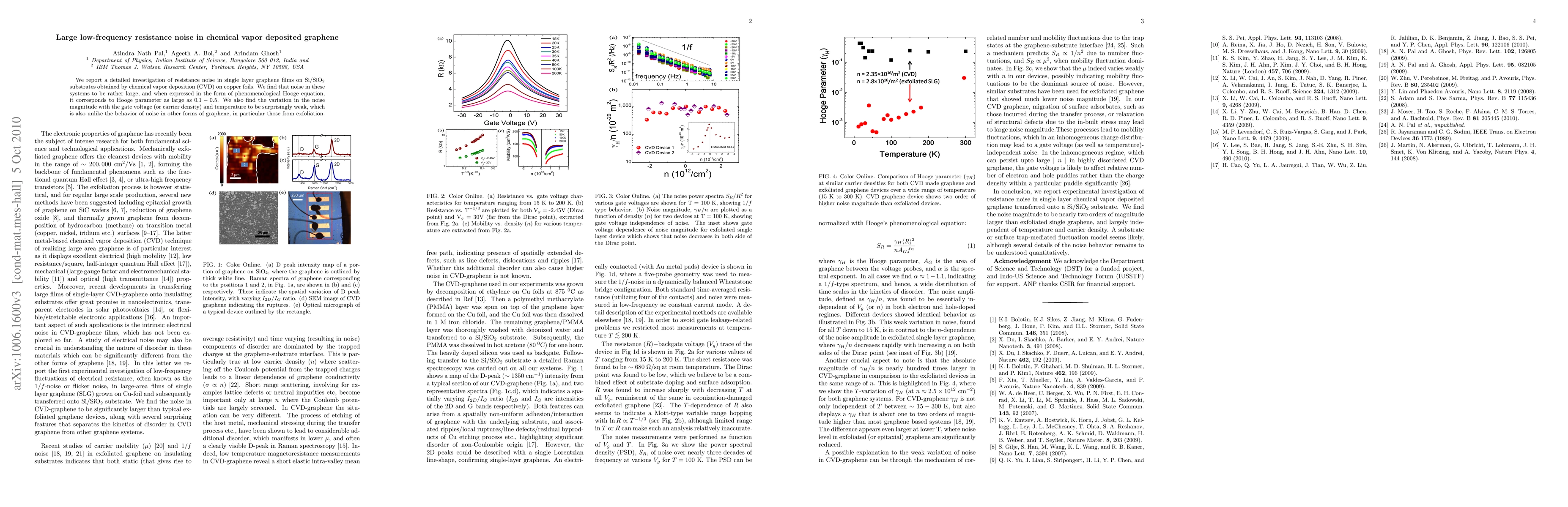 Researchers investigated resistance noise in single layer graphene films on Si/SiO2 substrates, finding large noise levels comparable to Hooge parameters of 0.1-0.5, with weak temperature and gate voltage dependence.
