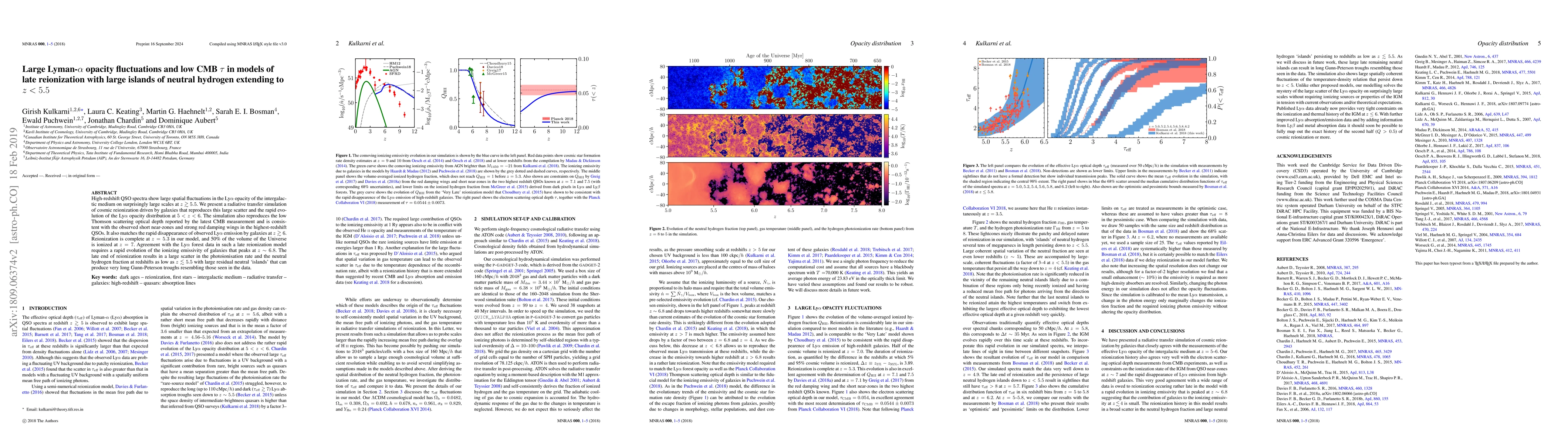 This paper presents a radiative transfer simulation of cosmic reionization driven by galaxies, showing large fluctuations in Lyman-alpha opacity at high redshifts and low CMB optical depth, consistent with late reionization models with large neutral hydrogen islands extending to z<5.5. The model matches observations and requires a rapid peak in galaxy ionizing emissivity at z~6.8.