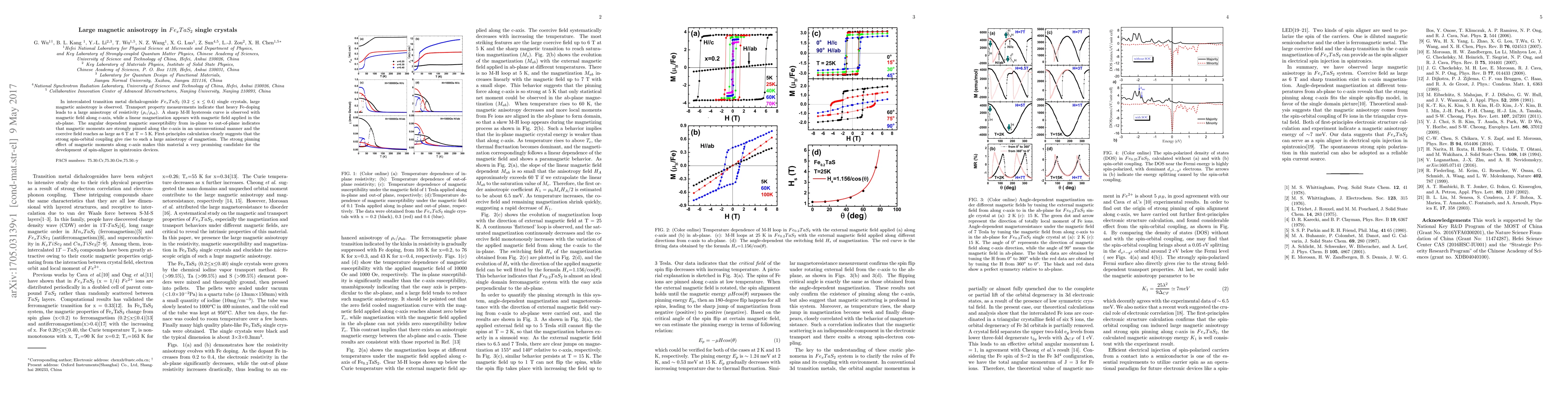 In intercalated transition metal dichalcogenide $Fe_xTaS_2$ (0.2 $\leq$ x $\leq$ 0.4) single crystals, large magnetic anisotropy is observed. Transport property measurements indicate that heavy Fe-doping leads to a large anisotropy of resistivity ($\rho$$_{c}$/$\rho$$_{ab}$). A sharp M-H hysteresis curve is observed with magnetic field along c-axis, while a linear magnetization appears with magnetic field applied in the ab-plane. The angular dependent magnetic susceptibility from in-plane to out-of-plane indicates that magnetic moments are strongly pinned along the c-axis in an unconventional manner and the coercive field reaches as large as 6 T at T = 5 K. First-principles calculation clearly suggests that the strong spin-orbital coupling give rise to such a large anisotropy of magnetism. The strong pinning effect of magnetic moments along c-axis makes this material a very promising candidate for the development of spin-aligner in spintronics devices.