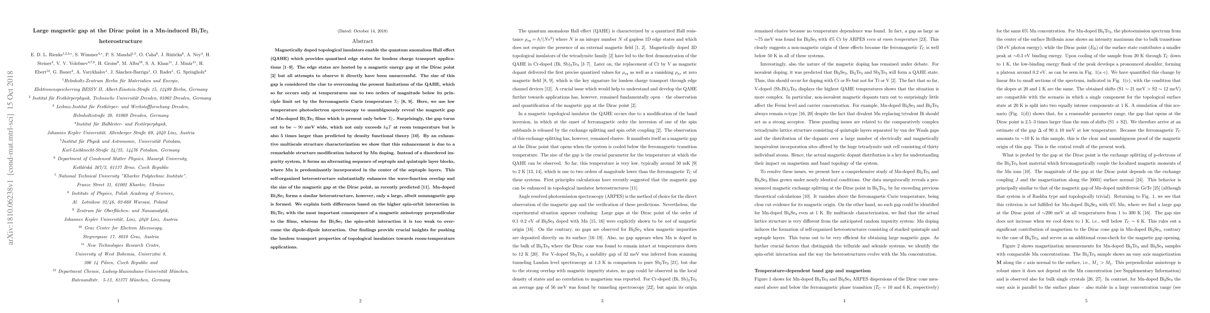 This paper reveals a large magnetic gap of approximately 90 meV in Mn-doped Bi$_2$Te$_3$ heterostructures, significantly larger than predicted, due to a self-organized structure modification. This discovery enhances the potential for quantum anomalous Hall effect applications at higher temperatures.