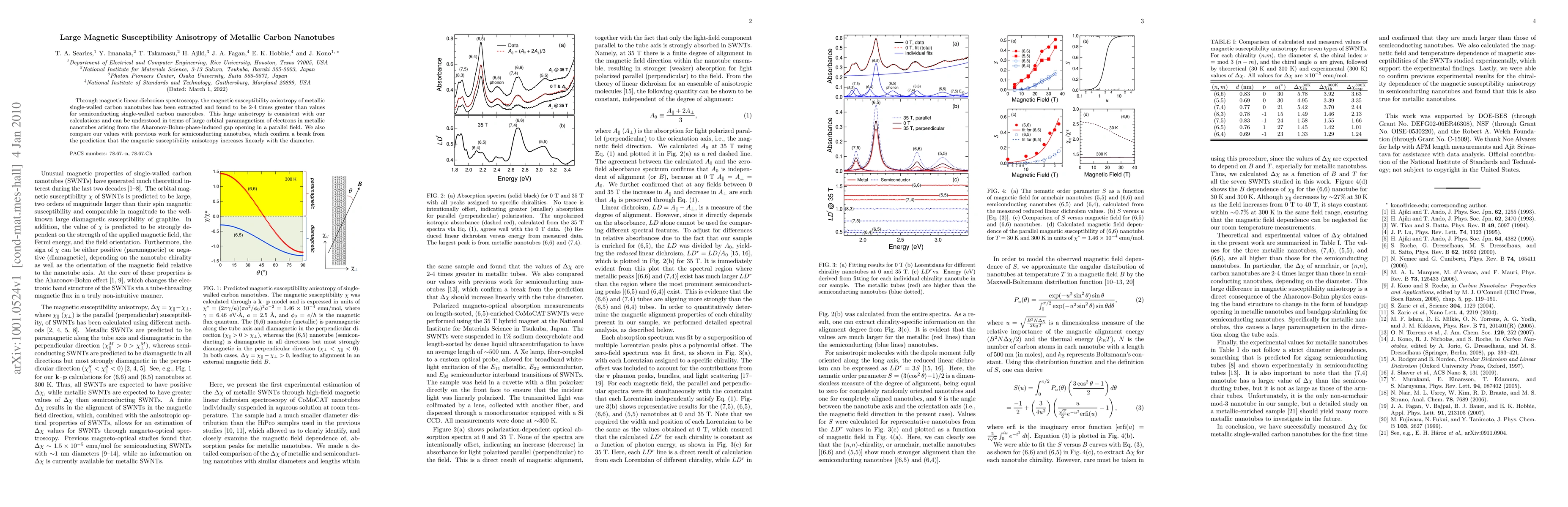This study reveals that metallic single-walled carbon nanotubes exhibit a magnetic susceptibility anisotropy 2-4 times greater than that of semiconducting counterparts, attributed to the large orbital paramagnetism caused by the Aharonov-Bohm effect. The findings challenge previous linear diameter-diameter correlation predictions for magnetic susceptibility anisotropy.