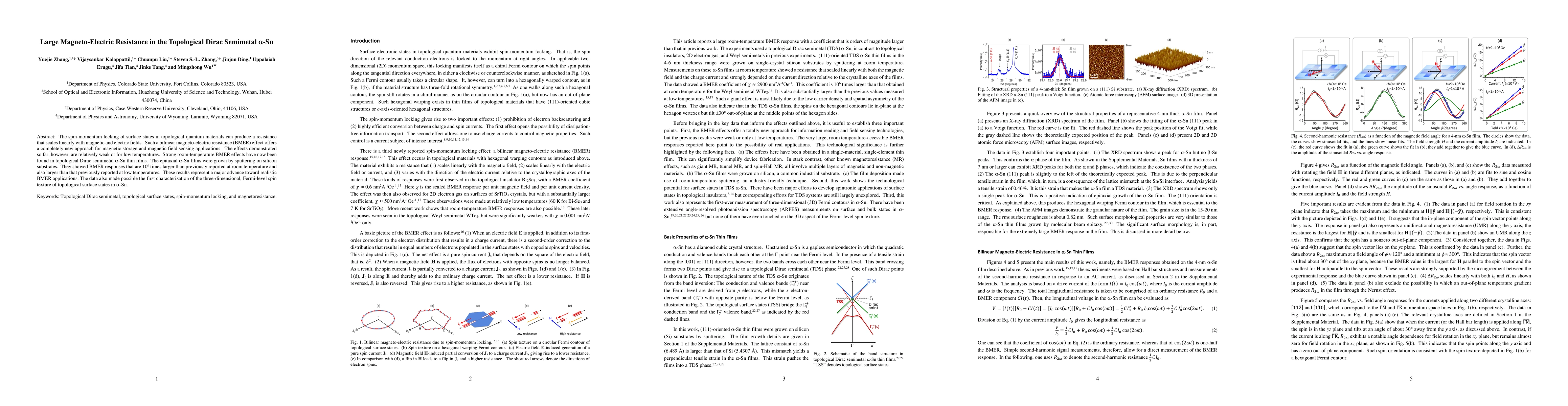 The spin-momentum locking of surface states in topological quantum materials can produce a resistance that scales linearly with magnetic and electric fields. Such a bilinear magneto-electric resistance (BMER) effect offers a completely new approach for magnetic storage and magnetic field sensing applications. The effects demonstrated so far, however, are relatively weak or for low temperatures. Strong room-temperature BMER effects have now been found in topological Dirac semimetal alpha-Sn thin films. The epitaxial alpha-Sn films were grown by sputtering on silicon substrates. They showed BMER responses that are 10^6 times larger than previously reported at room temperature and also larger than that previously reported at low temperatures. These results represent a major advance toward realistic BMER applications. The data also made possible the first characterization of the three-dimensional, Fermi-level spin texture of topological surface states in alpha-Sn.