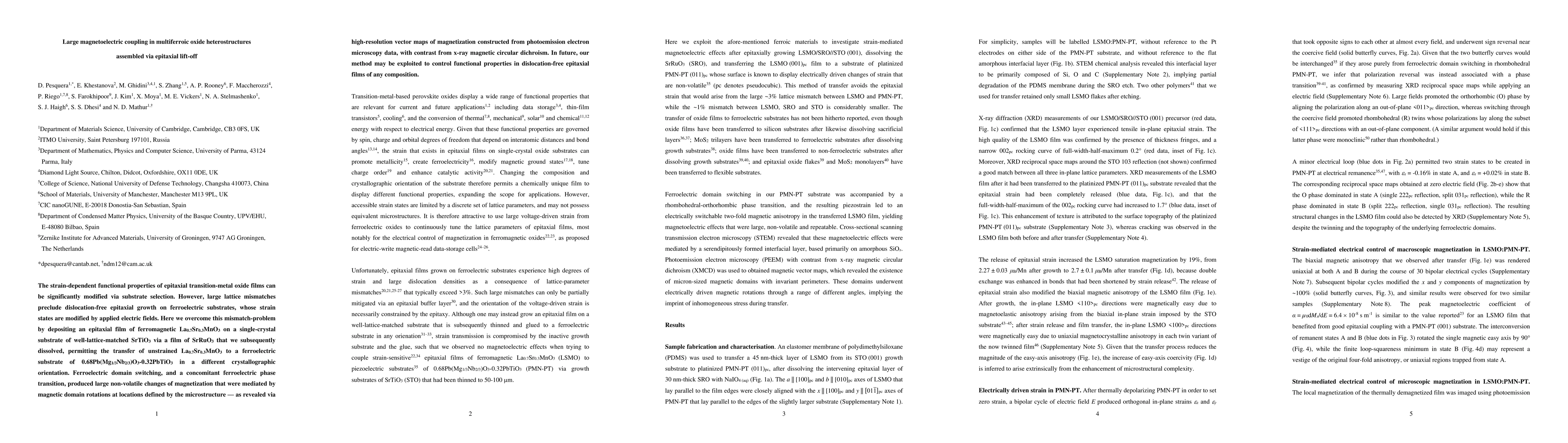 This paper demonstrates a method to achieve large magnetoelectric coupling in multiferroic oxide heterostructures by transferring an epitaxial film of La0.7Sr0.3MnO3 to a ferroelectric substrate, showing significant non-volatile changes in magnetization mediated by ferroelectric domain switching. The technique may enable control of functional properties in dislocation-free epitaxial films.