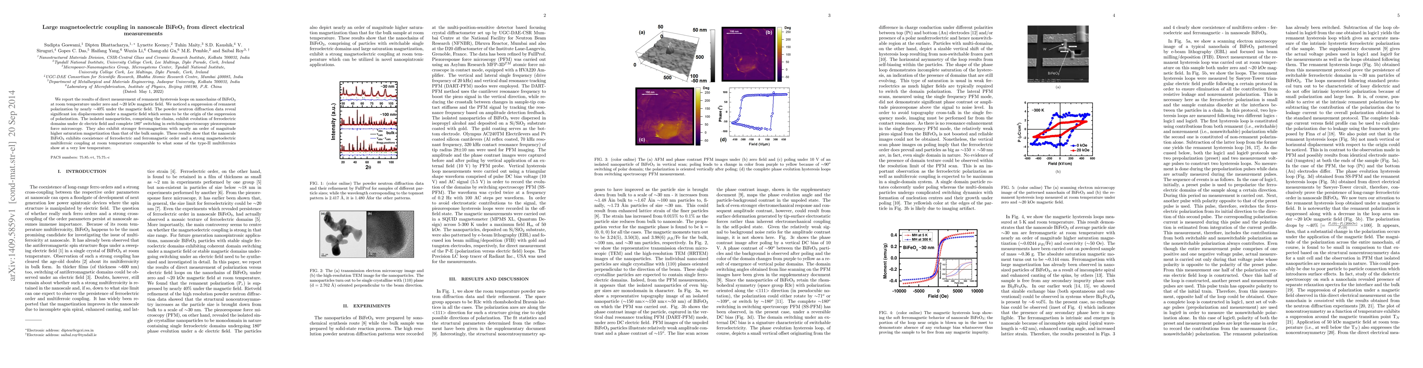 We report the results of direct measurement of remanent hysteresis loops on nanochains of BiFeO$_3$ at room temperature under zero and $\sim$20 kOe magnetic field. We noticed a suppression of remanent polarization by nearly $\sim$40\% under the magnetic field. The powder neutron diffraction data reveal significant ion displacements under a magnetic field which seems to be the origin of the suppression of polarization. The isolated nanoparticles, comprising the chains, exhibit evolution of ferroelectric domains under dc electric field and complete 180$^o$ switching in switching-spectroscopy piezoresponse force microscopy. They also exhibit stronger ferromagnetism with nearly an order of magnitude higher saturation magnetization than that of the bulk sample. These results show that the nanoscale BiFeO$_3$ exhibits coexistence of ferroelectric and ferromagnetic order and a strong magnetoelectric multiferroic coupling at room temperature comparable to what some of the type-II multiferroics show at a very low temperature.