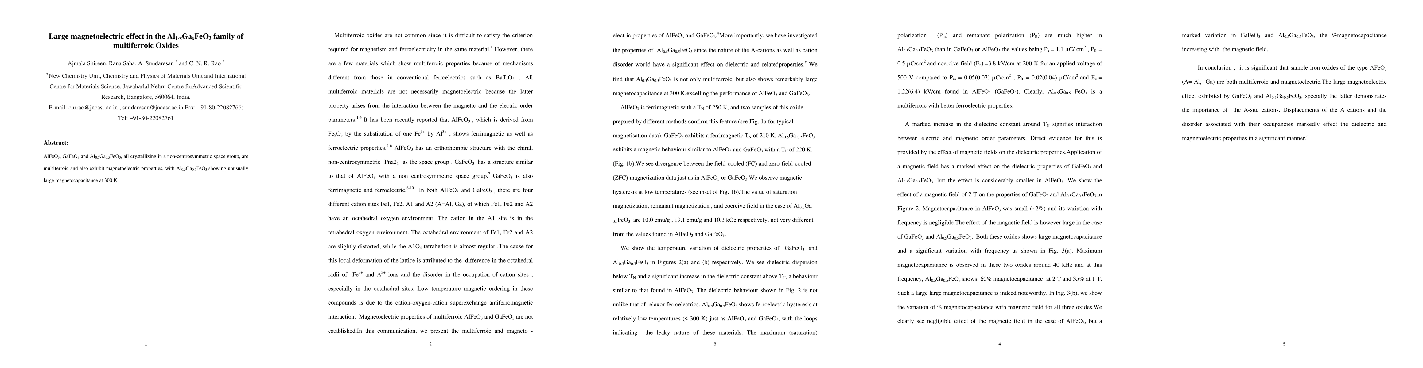 AlFeO3, GaFeO3 and Al0.5Ga0.5FeO3, all crystallizing in a non-centrosymmetric space group, are multiferroic and also exhibit magnetoelectric properties, with Al0.5Ga0.5FeO3 showing unusually large magnetocapacitance at 300 K.