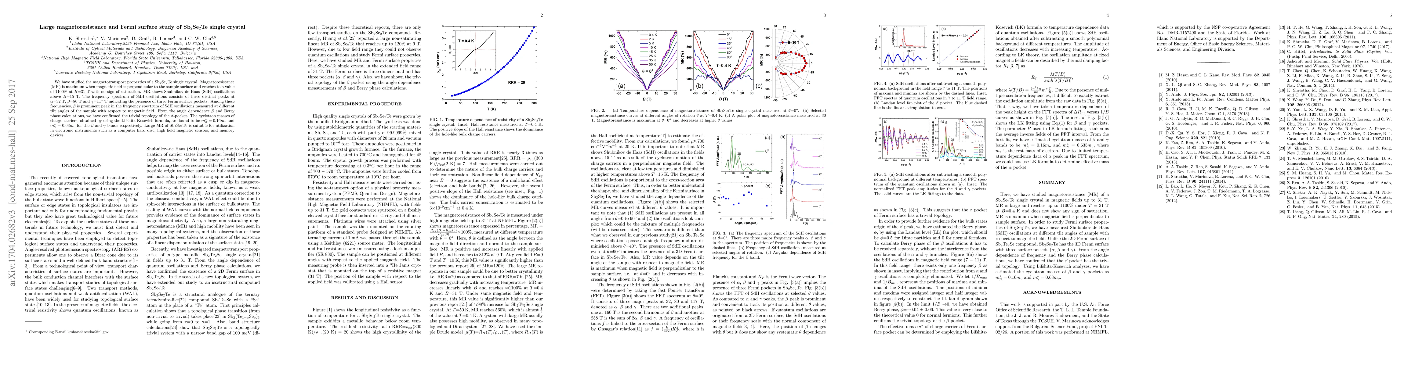 We have studied the magnetotransport properties of a Sb$_2$Se$_2$Te single crystal. Magnetoresistance (MR) is maximum when the magnetic field is perpendicular to the sample surface and reaches to a value of 1100\% at $B$=31 T with no sign of saturation. MR shows Shubnikov de Haas (SdH) oscillations above $B$=15 T. The frequency spectrum of SdH oscillations consists of three distinct peaks at $\alpha$=32 T, $\beta$=80 T and $\gamma$=117 T indicating the presence of three Fermi surface pockets. Among these frequencies, $\beta$ is the prominent peak in the frequency spectrum of SdH oscillations measured at different tilt angles of the sample with respect to the magnetic field. From the angle dependence $\beta$ and Berry phase calculations, we have confirmed the trivial topology of the $\beta$-pocket. The cyclotron masses of charge carriers, obtained by using the Lifshitz-Kosevich formula, are found to be $m^{*}_{\beta}=0.16m_o$ and $m^{*}_{\gamma}=0.63m_o$ for the $\beta$ and $\gamma$ bands respectively. Large MR of Sb$_2$Se$_2$Te is suitable for utilization in electronic instruments such as a computer hard disc, high field magnetic sensors, and memory devices.