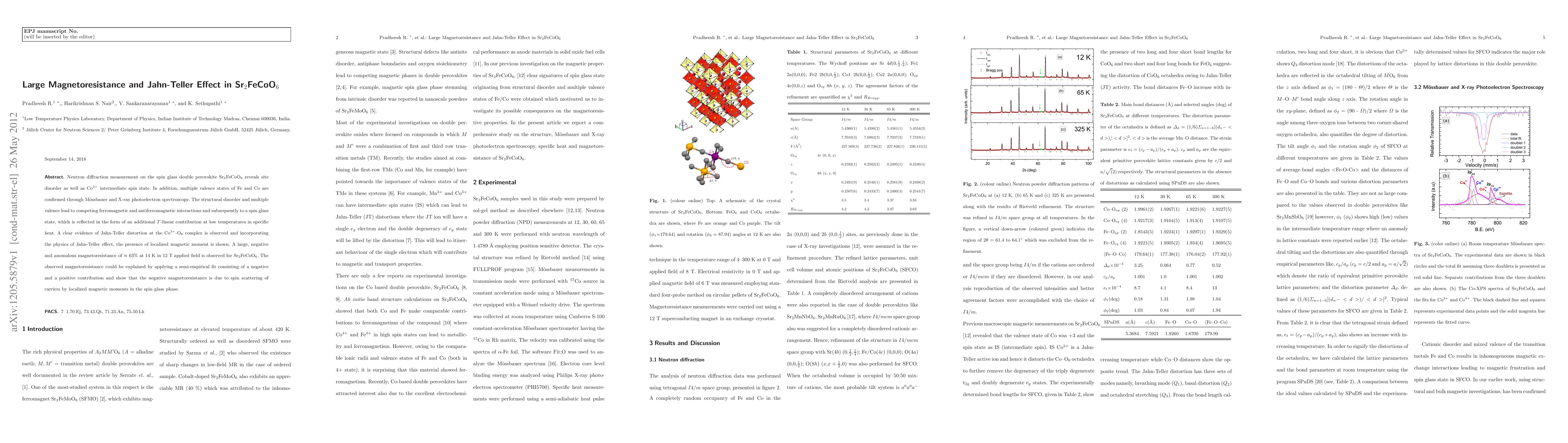 Neutron diffraction and spectroscopic studies on Sr$_2$FeCoO$_6$ reveal site disorder and Jahn-Teller distortion, leading to a spin glass state and large magnetoresistance of ~63% at 14K in a 12T field, attributed to spin scattering by localized magnetic moments.