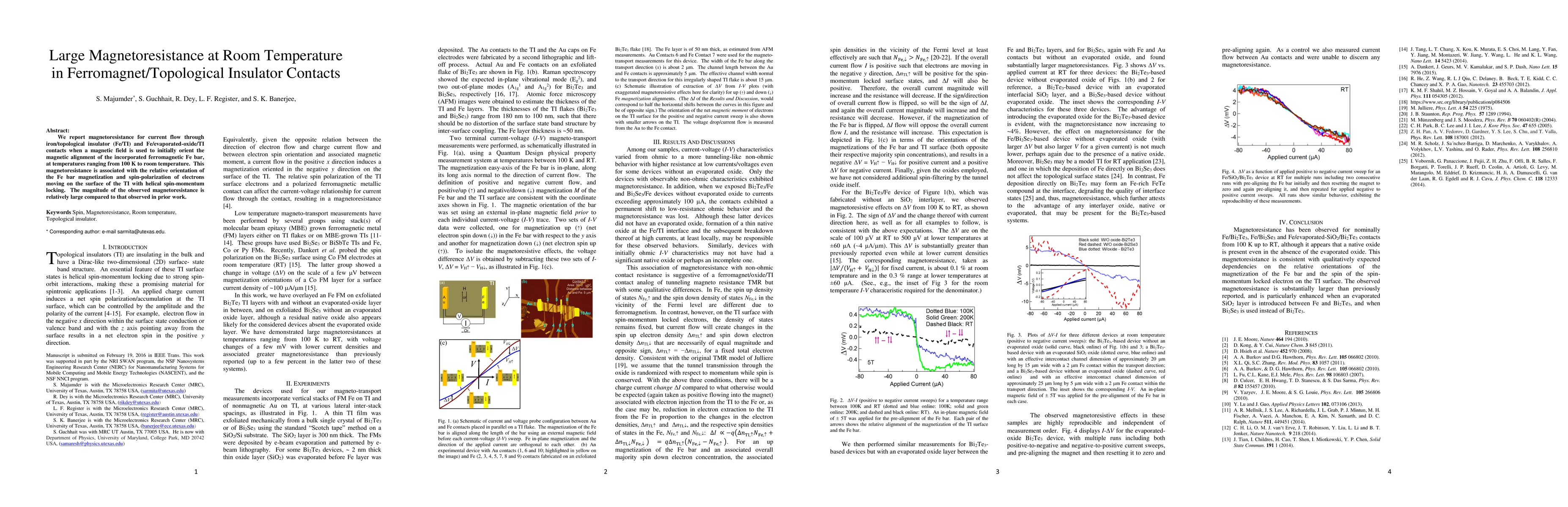 We report magnetoresistance for current flow through iron/topological insulator (Fe/TI) and Fe/evaporated-oxide/TI contacts when a magnetic field is used to initially orient the magnetic alignment of the incorporated ferromagnetic Fe bar, at temperatures ranging from 100 K to room temperature. This magnetoresistance is associated with the relative orientation of the Fe bar magnetization and spin-polarization of electrons moving on the surface of the TI with helical spin-momentum locking. The magnitude of the observed magnetoresistance is relatively large compared to that observed in prior work.