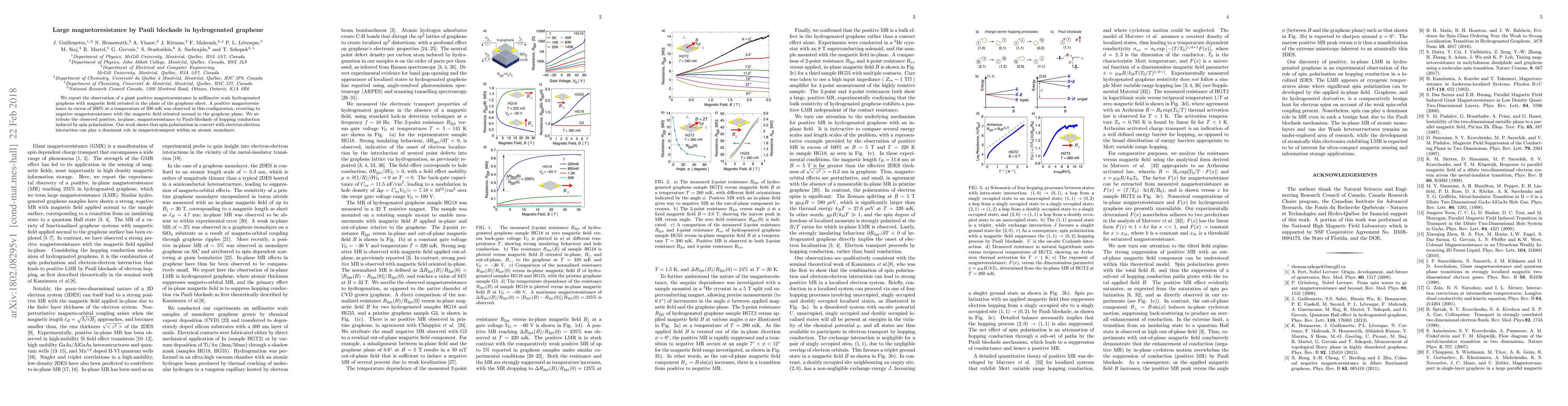 The research reports a giant positive magnetoresistance of over 200% in hydrogenated graphene with magnetic fields aligned in the graphene plane, attributed to Pauli blockade of spin-polarized hopping conduction, demonstrating significant spin polarization effects in magnetotransport.