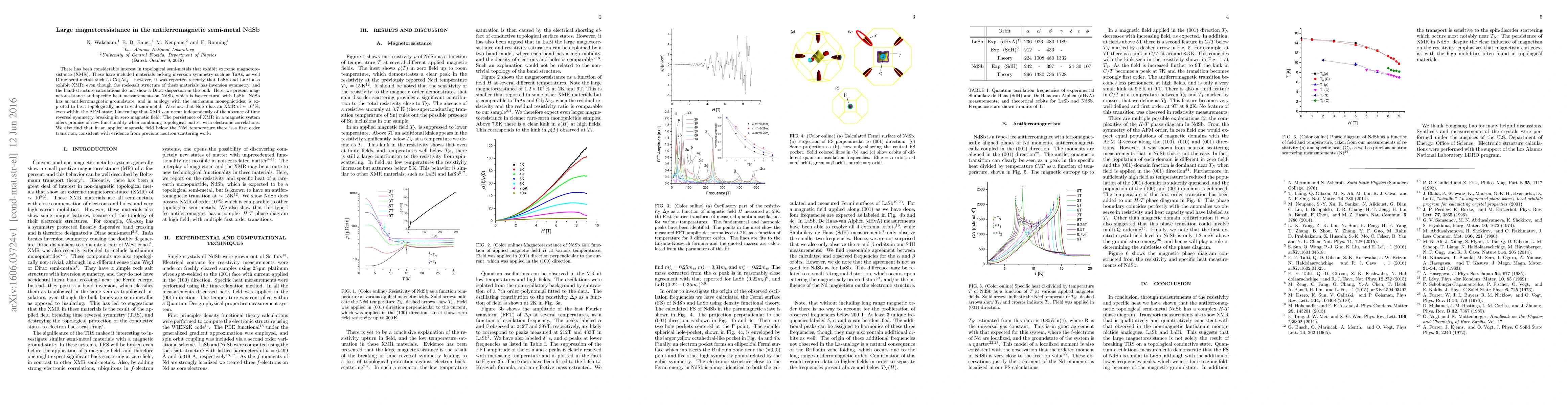 This paper reports large magnetoresistance (10^4 %) in the antiferromagnetic semi-metal NdSb, demonstrating that extreme magnetoresistance can occur even in magnetic systems without time reversal symmetry breaking. The findings suggest new functionalities when combining topological matter with electronic correlations.