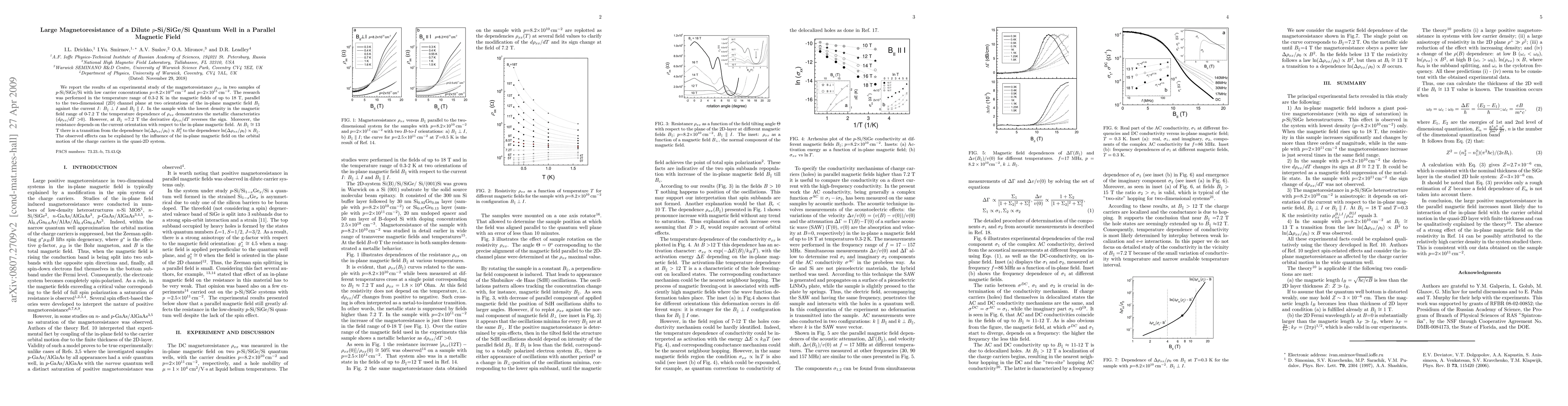 This study investigates the magnetoresistance in low-carrier $p$-Si/SiGe/Si quantum wells under parallel magnetic fields, revealing a transition in resistance behavior and a sign change in temperature dependence at specific magnetic field strengths, attributed to the magnetic field's effect on carrier orbital motion.