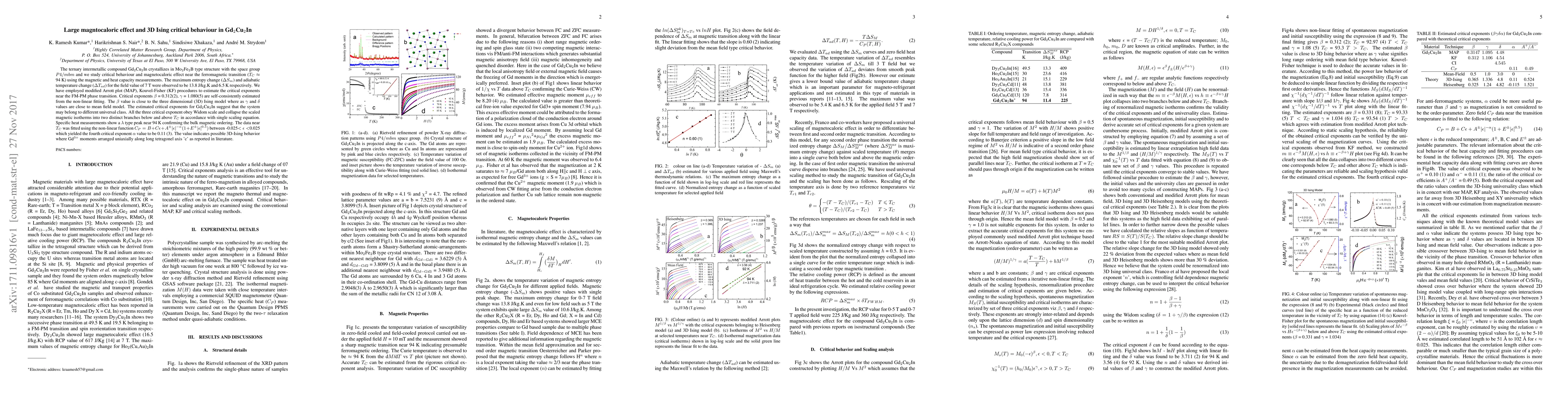 The ternary intermetallic compound Gd$_2$Cu$_2$In crystallizes in Mo$_2$Fe$_2$B type structure with the space group $P4/mbm$ and we study critical behaviour and magnetocaloric effect near the ferromagnetic transition ($T_C$ $\approx$ 94 K) using the magnetic and heat capacity measurements. The maximum entropy change ($\Delta S_m$) and adiabatic temperature change ($\Delta T_{ad}$) for the field value of 7 T were observed to be 13.8 J/kg.K and 6.5 K respectively. We have employed modified Arrott plot (MAP), Kouvel-Fisher (KF) procedures to estimate the critical exponents near the FM-PM phase transition. Critical exponents $\beta$ = 0.312(2), $\gamma$ = 1.080(5) are self-consistently estimated from the non-linear fitting. The $\beta$ value is close to the three dimensional (3D) Ising model where as $\gamma$ and $\delta$ values are close to mean field model. The estimated critical exponents for Gd$_2$Cu$_2$In suggest that the system may belong to different universal class. All the three critical exponent obey Widom scale and collapse the scaled magnetic isotherms into two distinct branches below and above $T_C$ in accordance with single scaling equation. Specific heat measurements show a $\lambda$ type peak near 94 K confirming the bulk magnetic ordering. The data near $T_C$ was fitted using the non-linear function $C_{P} = B + C\epsilon + A^{\pm}|\epsilon|^{-\alpha}(1 + E^{\pm} |\epsilon|^{0.5})$ between -0.025$<\epsilon<$0.025 which yielded the fourth critical exponent $\alpha$ value to be 0.11 (3). The value indicates possible 3D-Ising behavior where Gd$^{3+}$ moments arranged uniaxially along long tetragonel axis 'c' as reported in literature.