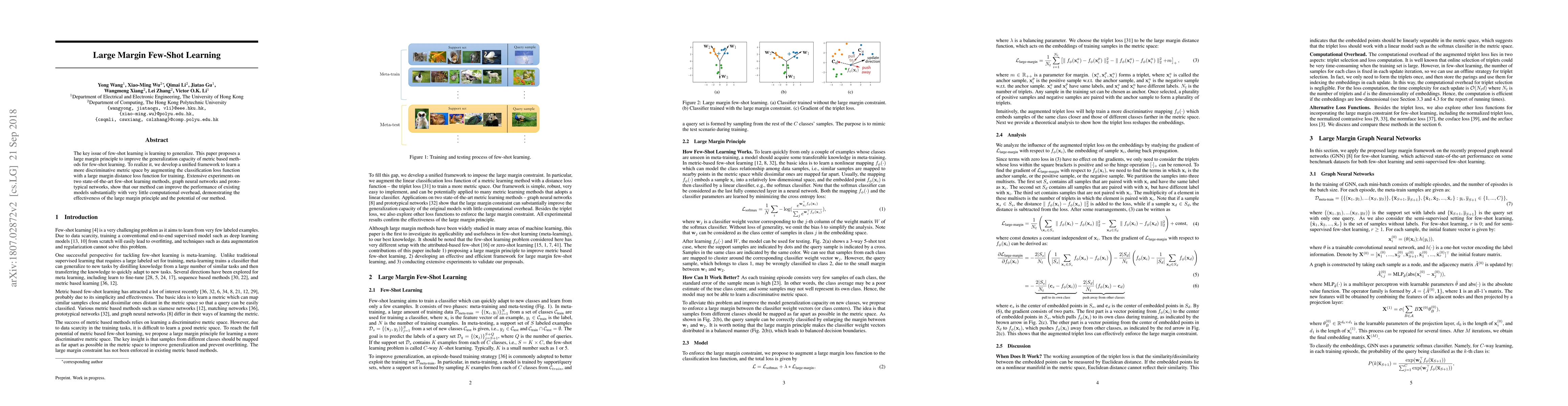 This paper introduces a large margin principle to enhance the generalization of few-shot learning methods, proposing a unified framework that incorporates a large margin distance loss to learn a more discriminative metric space. Experiments show significant performance improvements for existing models like graph neural networks and prototypical networks with minimal additional computational cost.
