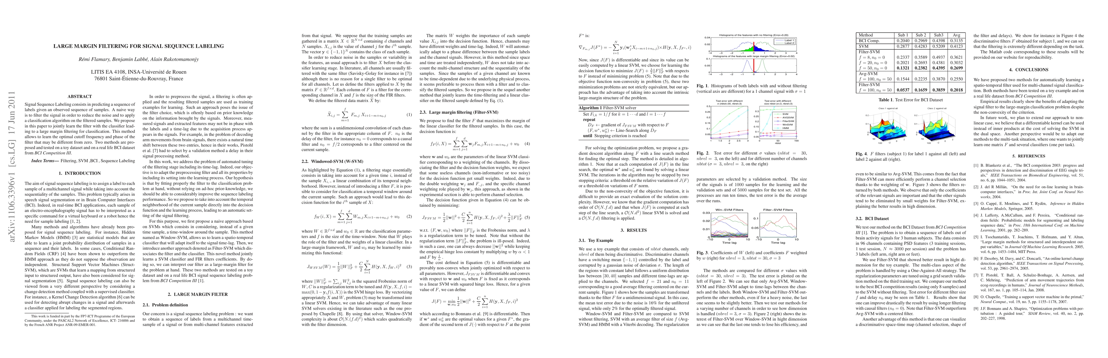 Signal Sequence Labeling consists in predicting a sequence of labels given an observed sequence of samples. A naive way is to filter the signal in order to reduce the noise and to apply a classification algorithm on the filtered samples. We propose in this paper to jointly learn the filter with the classifier leading to a large margin filtering for classification. This method allows to learn the optimal cutoff frequency and phase of the filter that may be different from zero. Two methods are proposed and tested on a toy dataset and on a real life BCI dataset from BCI Competition III.