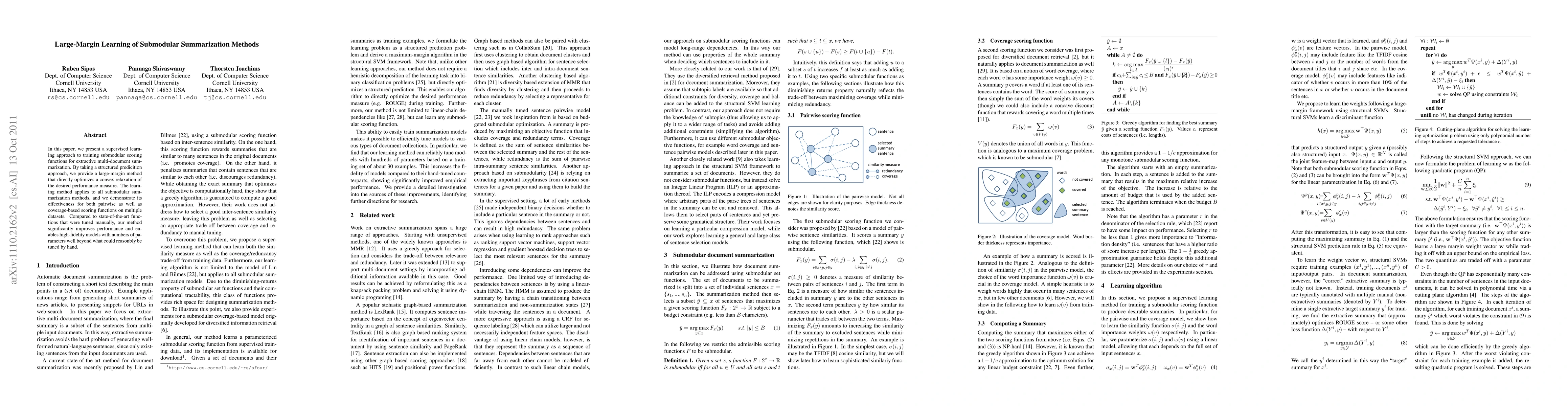 This paper introduces a supervised learning method for training submodular scoring functions in extractive multi-document summarization, optimizing a convex relaxation of performance measures for large-margin learning. The approach outperforms manually tuned state-of-the-art methods, demonstrating significant performance improvements across various datasets.