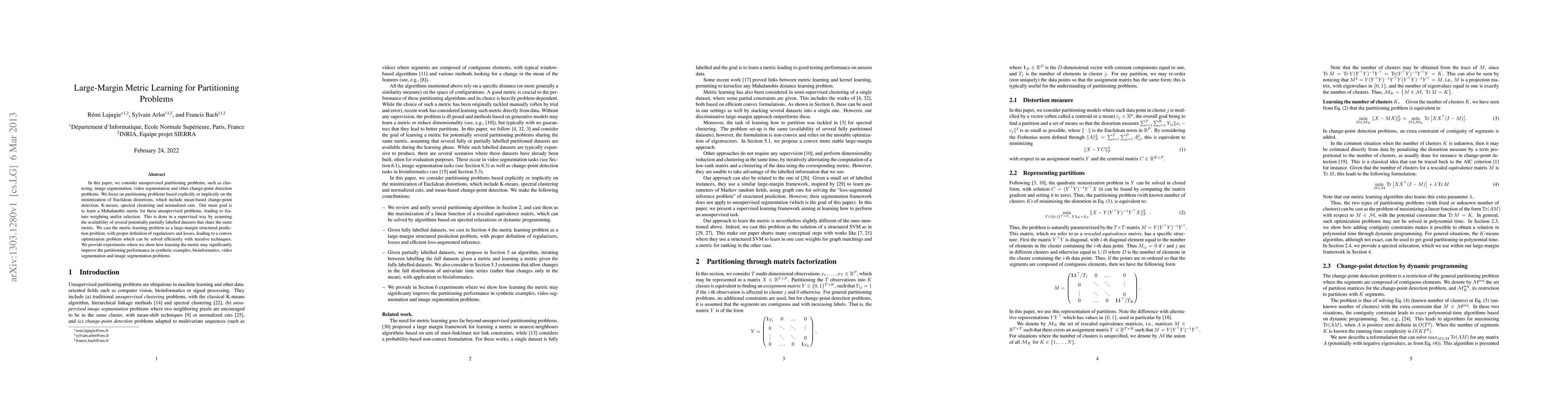 In this paper, we consider unsupervised partitioning problems, such as clustering, image segmentation, video segmentation and other change-point detection problems. We focus on partitioning problems based explicitly or implicitly on the minimization of Euclidean distortions, which include mean-based change-point detection, K-means, spectral clustering and normalized cuts. Our main goal is to learn a Mahalanobis metric for these unsupervised problems, leading to feature weighting and/or selection. This is done in a supervised way by assuming the availability of several potentially partially labelled datasets that share the same metric. We cast the metric learning problem as a large-margin structured prediction problem, with proper definition of regularizers and losses, leading to a convex optimization problem which can be solved efficiently with iterative techniques. We provide experiments where we show how learning the metric may significantly improve the partitioning performance in synthetic examples, bioinformatics, video segmentation and image segmentation problems.