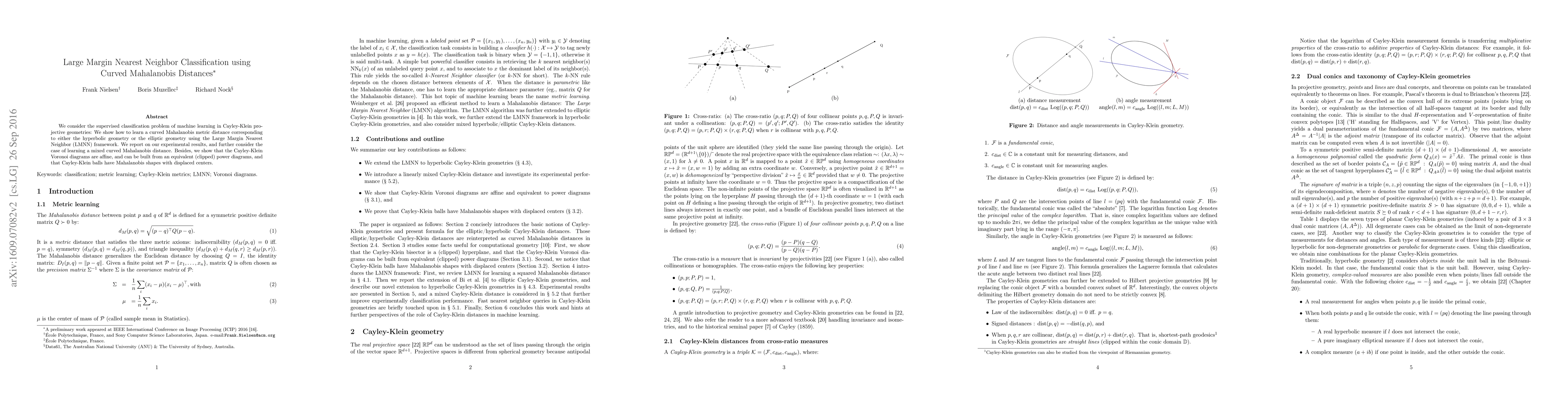 We consider the supervised classification problem of machine learning in Cayley-Klein projective geometries: We show how to learn a curved Mahalanobis metric distance corresponding to either the hyperbolic geometry or the elliptic geometry using the Large Margin Nearest Neighbor (LMNN) framework. We report on our experimental results, and further consider the case of learning a mixed curved Mahalanobis distance. Besides, we show that the Cayley-Klein Voronoi diagrams are affine, and can be built from an equivalent (clipped) power diagrams, and that Cayley-Klein balls have Mahalanobis shapes with displaced centers.