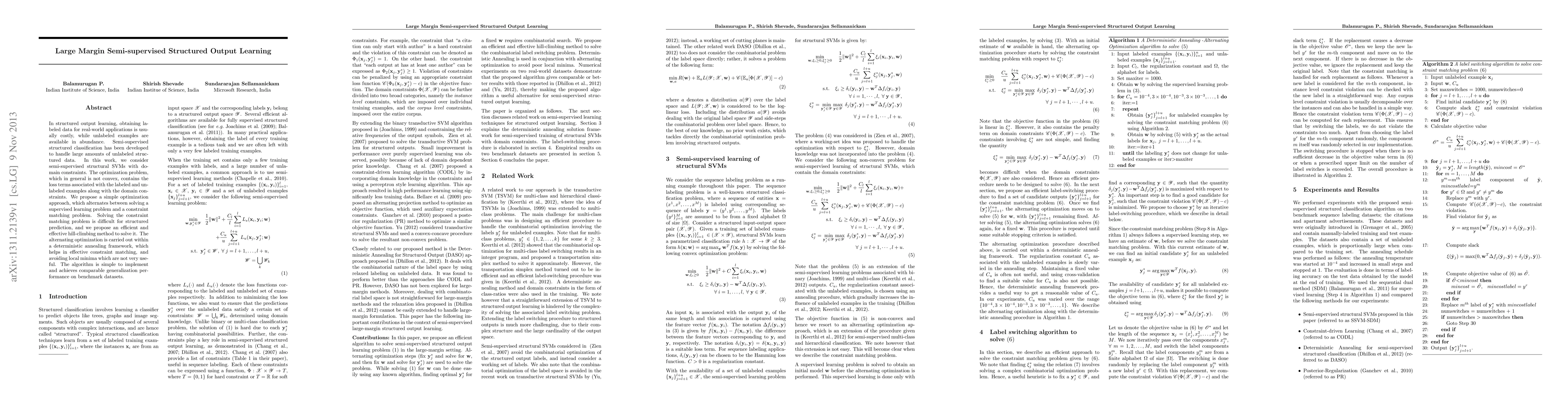 This paper proposes a semi-supervised structural SVM approach with domain constraints to handle large amounts of unlabelled data in structured output learning. The method alternates between supervised learning and a hill-climbing solution for constraint matching within a deterministic annealing framework, achieving comparable performance on benchmarks.