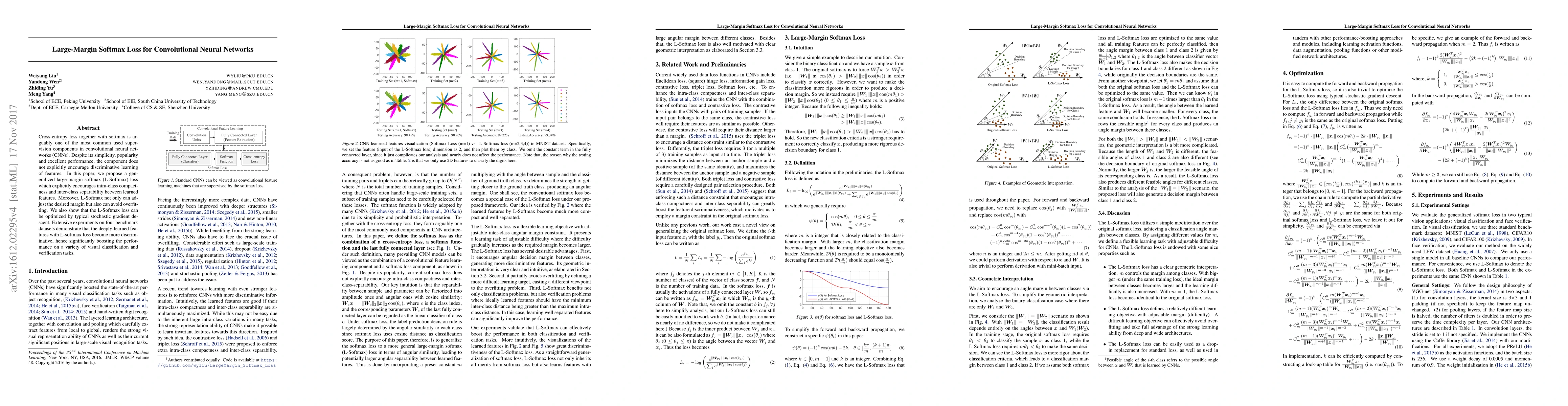 This paper proposes a generalized large-margin softmax (L-Softmax) loss for convolutional neural networks to enhance feature discriminative learning by encouraging intra-class compactness and inter-class separability. The L-Softmax loss adjusts margins and mitigates overfitting, significantly improving performance on visual classification and verification tasks.