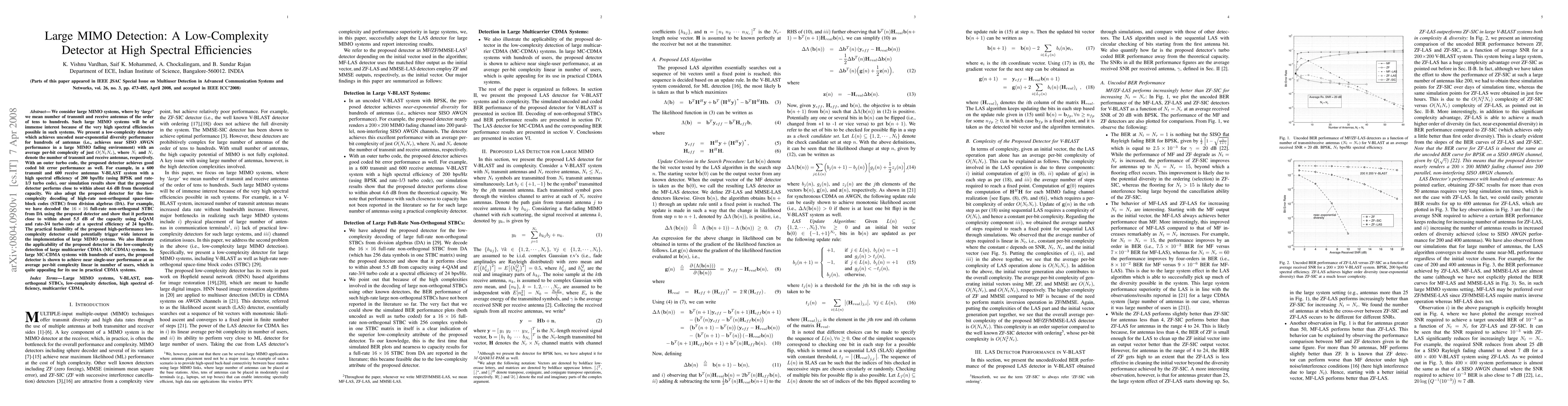 This paper introduces a low-complexity detector for large MIMO systems with hundreds of antennas, achieving near SISO AWGN performance with an average per-bit complexity of $O(N_tN_r)$. The detector also performs well with turbo codes and non-orthogonal space-time block codes, nearing theoretical capacity limits.