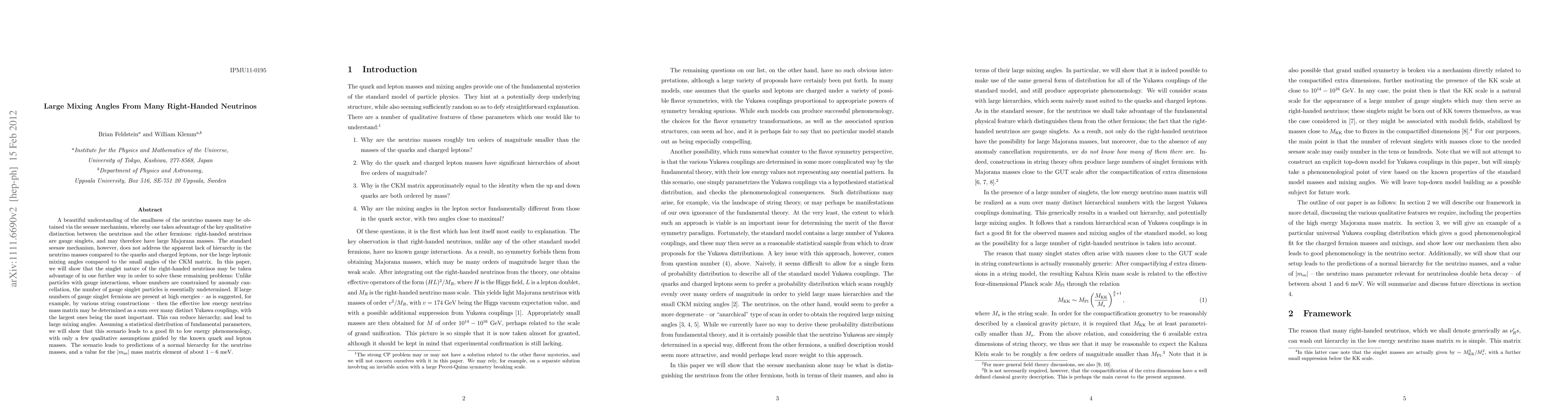 This paper proposes that large numbers of right-handed neutrino gauge singlets can explain the smallness of neutrino masses and the large mixing angles observed in low energy phenomenology through the seesaw mechanism. The model predicts a normal hierarchy for neutrino masses and a specific value for the |m_ee| mass matrix element.