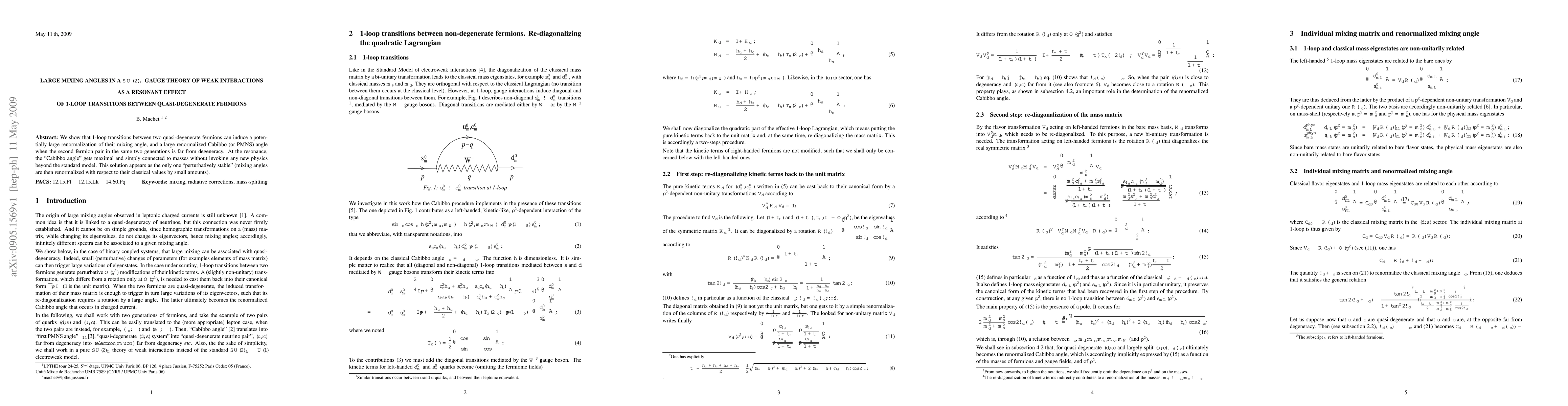We show that 1-loop transitions between two quasi-degenerate fermions can induce a potentially large renormalization of their mixing angle, and a large renormalized Cabibbo (or PMNS) angle when the second fermion pair in the same two generations is far from degeneracy. At the resonance, the "Cabibbo angle" gets maximal and simply connected to masses without invoking any new physics beyond the standard model. This solution appears as the only one "perturbatively stable" (mixing angles are then renormalized with respect to their classical values by small amounts).