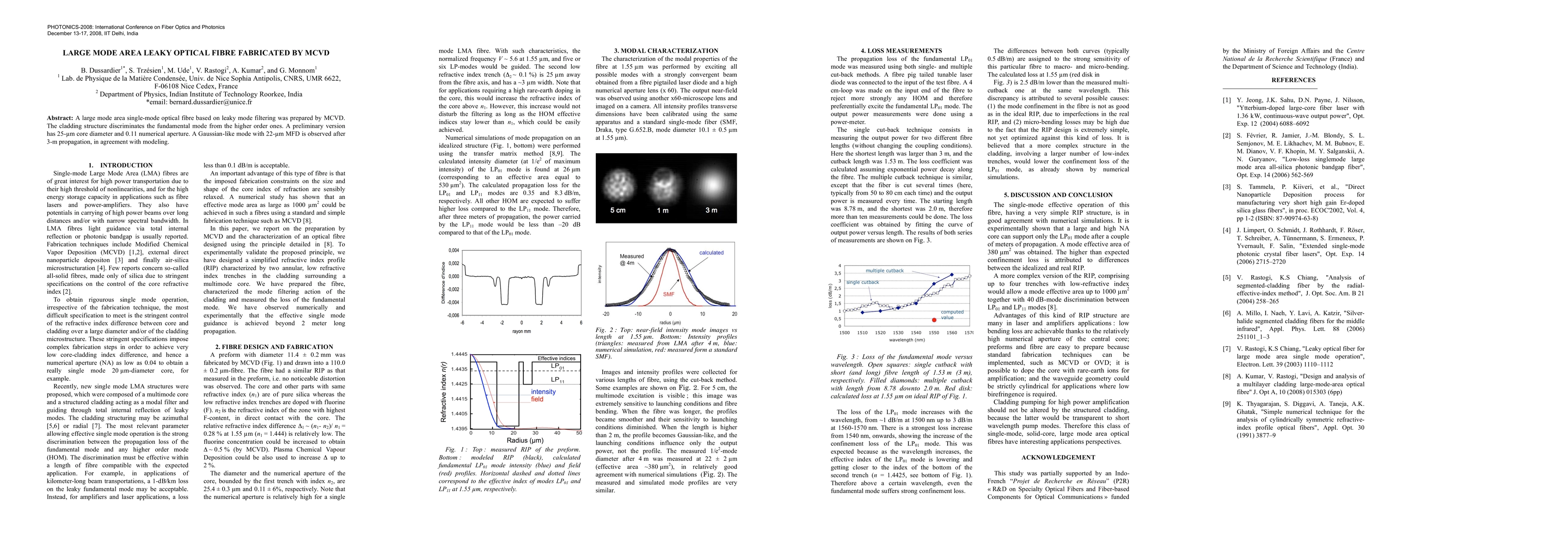 The paper presents a new design for large mode area single-mode fibres using MCVD, featuring a multimode core and a structured cladding that acts as a modal filter, guiding through total internal reflection of leaky modes.