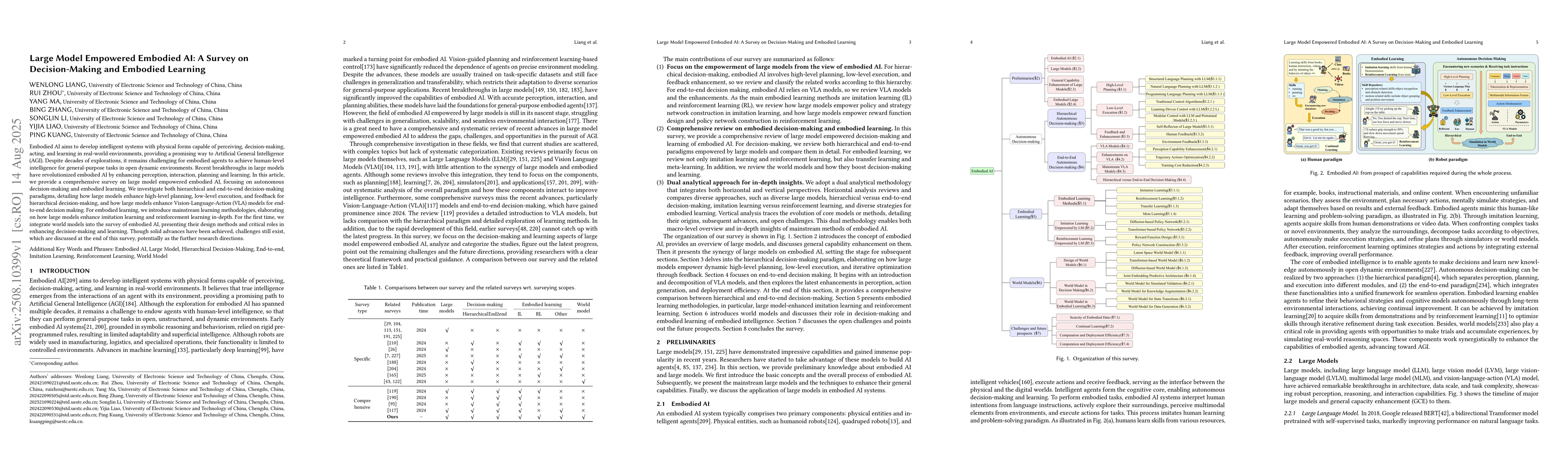 Embodied AI aims to develop intelligent systems with physical forms capable of perceiving, decision-making, acting, and learning in real-world environments, providing a promising way to Artificial General Intelligence (AGI). Despite decades of explorations, it remains challenging for embodied agents to achieve human-level intelligence for general-purpose tasks in open dynamic environments. Recent breakthroughs in large models have revolutionized embodied AI by enhancing perception, interaction, planning and learning. In this article, we provide a comprehensive survey on large model empowered embodied AI, focusing on autonomous decision-making and embodied learning. We investigate both hierarchical and end-to-end decision-making paradigms, detailing how large models enhance high-level planning, low-level execution, and feedback for hierarchical decision-making, and how large models enhance Vision-Language-Action (VLA) models for end-to-end decision making. For embodied learning, we introduce mainstream learning methodologies, elaborating on how large models enhance imitation learning and reinforcement learning in-depth. For the first time, we integrate world models into the survey of embodied AI, presenting their design methods and critical roles in enhancing decision-making and learning. Though solid advances have been achieved, challenges still exist, which are discussed at the end of this survey, potentially as the further research directions.