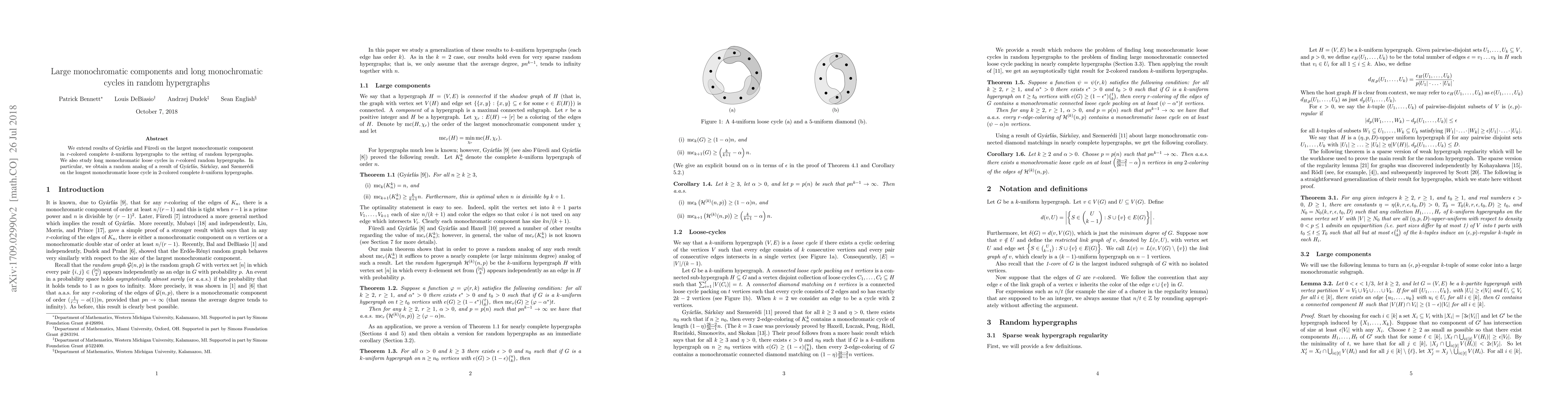 We extend results of Gy\'arf\'as and F\"uredi on the largest monochromatic component in $r$-colored complete $k$-uniform hypergraphs to the setting of random hypergraphs. We also study long monochromatic loose cycles in $r$-colored random hypergraphs. In particular, we obtain a random analog of a result of Gy\'arf\'as, S\'ark\"ozy, and Szemer\'edi on the longest monochromatic loose cycle in $2$-colored complete $k$-uniform hypergraphs.