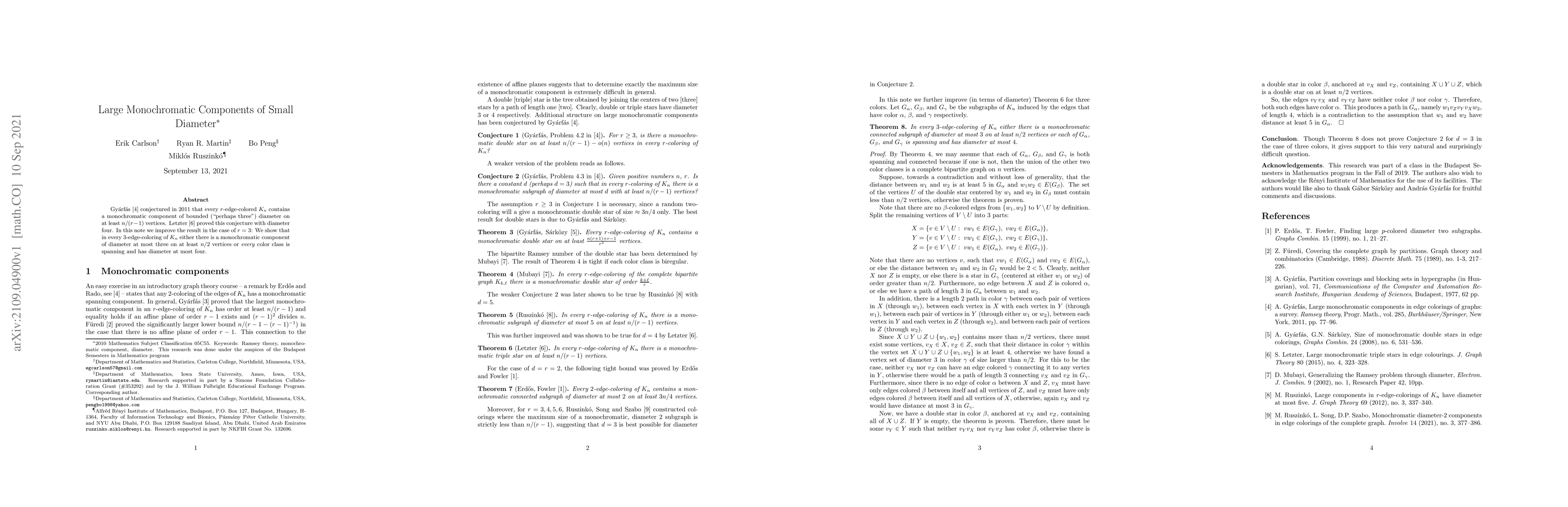 Researchers improved a conjecture about graph coloring, showing that in every 3-edge-coloring of complete graphs (K_n), either there is a monochromatic component of diameter at most three on at least n/2 vertices or every color class has a diameter of at most four.