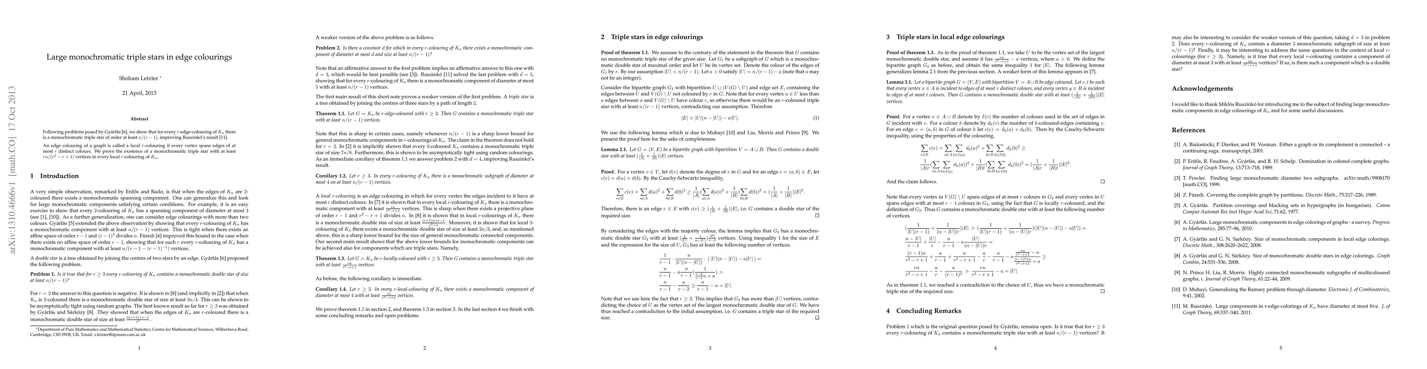 This paper improves upon previous results by demonstrating the existence of large monochromatic triple stars in edge-coloured complete graphs, showing that for every $r$-edge-colouring of $K_n$, there exists a monochromatic triple star of order at least $n/(r-1)$. It also proves the existence of a larger monochromatic triple star in local $r$-colourings of $K_n$.