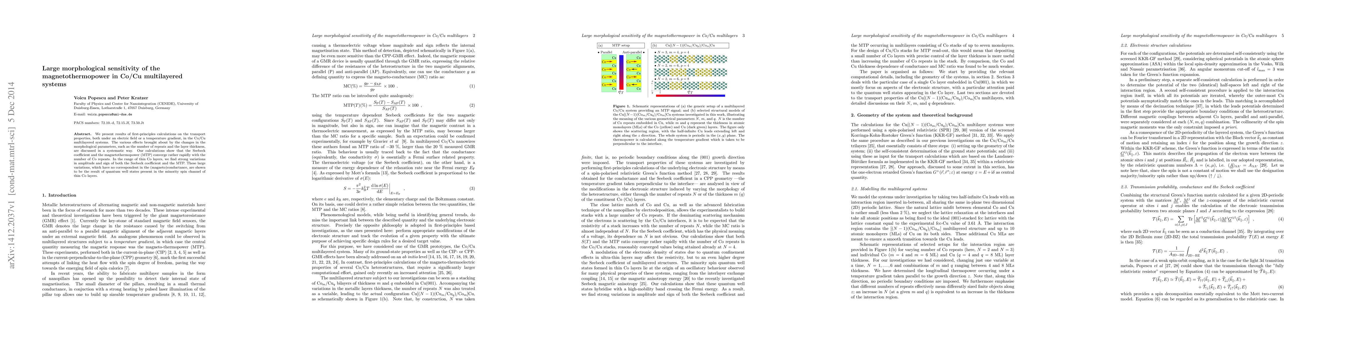 We present results of first-principles calculations on the transport properties, both under an electric field or a temperature gradient, in the Co/Cu multilayered systems. The various effects brought about by the changes in the morphological parameters, such as the number of repeats and the layer thickness, are discussed in a systematic way. Our calculations show that the Seebeck coefficient and the magnetothermopower (MTP) converge rather rapidly with the number of Co repeats. In the range of thin Co layers, we find strong variations in amplitude and sign of both the Seebeck coefficient and the MTP. These large variations, which have no correspondent in the (magneto)conductance, are shown to be the result of quantum well states present in the minority spin channel of thin Co layers.