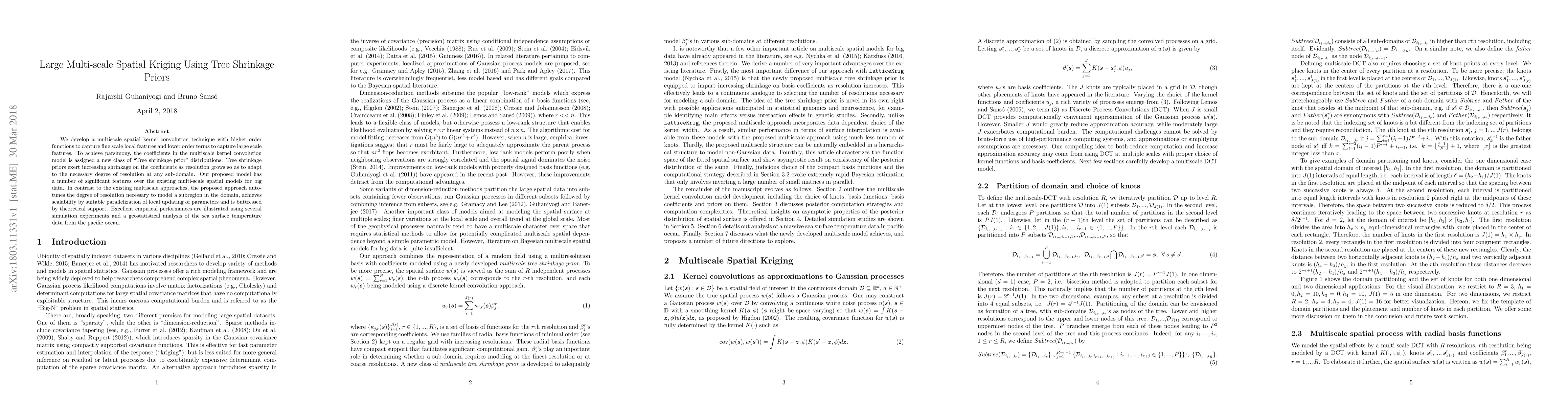 We develop a multiscale spatial kernel convolution technique with higher order functions to capture fine scale local features and lower order terms to capture large scale features. To achieve parsimony, the coefficients in the multiscale kernel convolution model is assigned a new class of "Tree shrinkage prior" distributions. Tree shrinkage priors exert increasing shrinkage on the coefficients as resolution grows so as to adapt to the necessary degree of resolution at any sub-domain. Our proposed model has a number of significant features over the existing multi-scale spatial models for big data. In contrast to the existing multiscale approaches, the proposed approach auto-tunes the degree of resolution necessary to model a subregion in the domain, achieves scalability by suitable parallelization of local updating of parameters and is buttressed by theoretical support. Excellent empirical performances are illustrated using several simulation experiments and a geostatistical analysis of the sea surface temperature data from the pacific ocean.