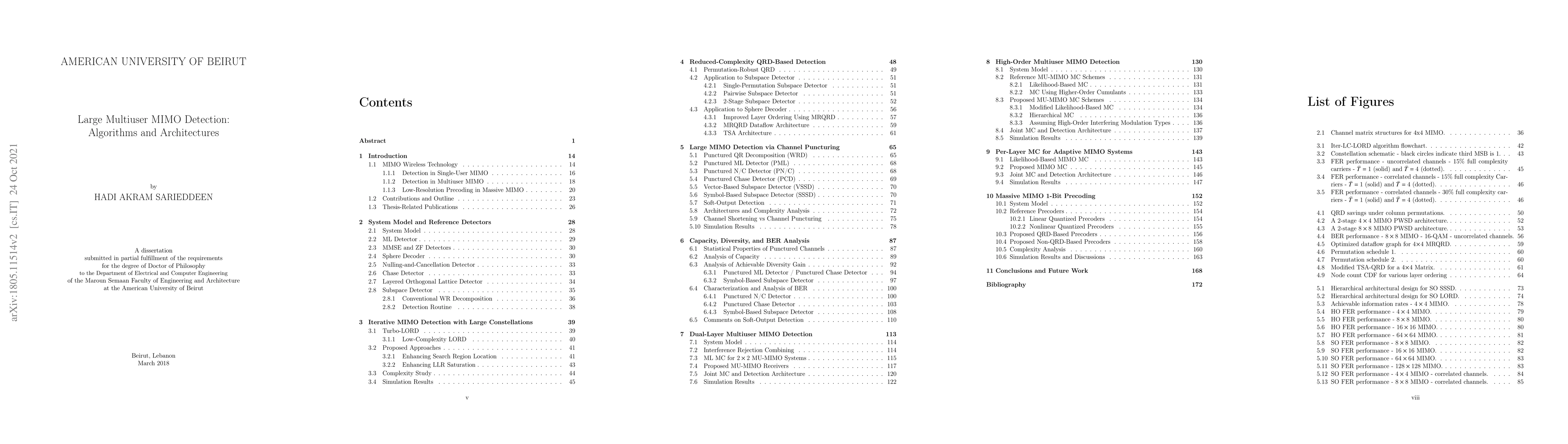 This paper proposes low-complexity detection algorithms for large MIMO and high-order MU-MIMO systems, including channel matrix puncturing schemes and joint modulation classification detectors. It also designs hardware architectures and analyzes performance-complexity tradeoffs for massive MIMO precoding.