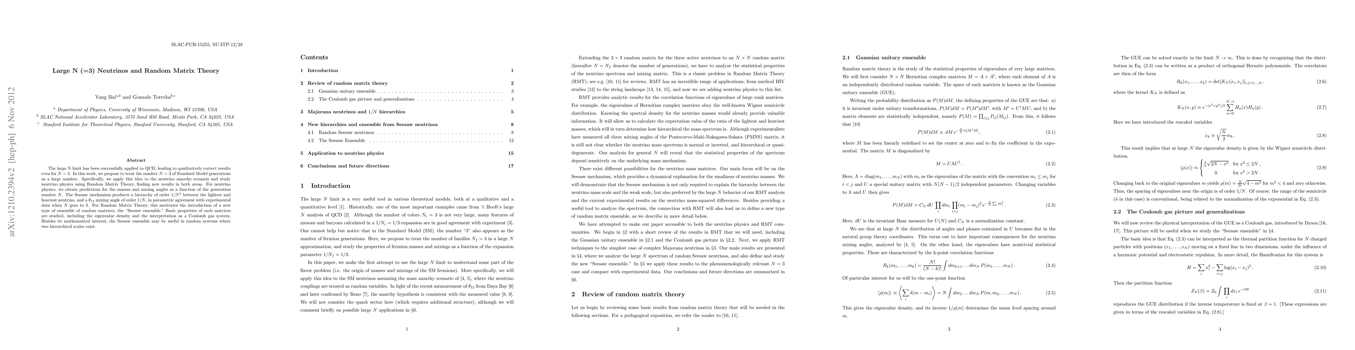 The large N limit has been successfully applied to QCD, leading to qualitatively correct results even for N=3. In this work, we propose to treat the number N=3 of Standard Model generations as a large number. Specifically, we apply this idea to the neutrino anarchy scenario and study neutrino physics using Random Matrix Theory, finding new results in both areas. For neutrino physics, we obtain predictions for the masses and mixing angles as a function of the generation number N. The Seesaw mechanism produces a hierarchy of order 1/N^3 between the lightest and heaviest neutrino, and a theta(13) mixing angle of order 1/N, in parametric agreement with experimental data when N goes to 3. For Random Matrix Theory, this motivates the introduction of a new type of ensemble of random matrices, the "Seesaw ensemble." Basic properties of such matrices are studied, including the eigenvalue density and the interpretation as a Coulomb gas system. Besides its mathematical interest, the Seesaw ensemble may be useful in random systems where two hierarchical scales exist.