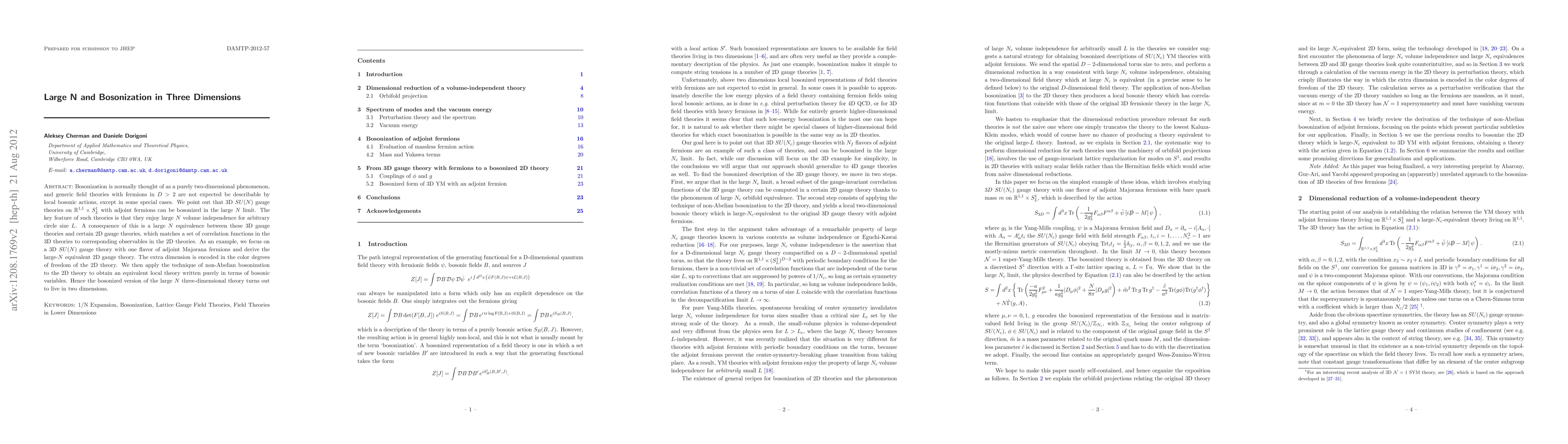 The novelty lies in extending the bosonization concept to three dimensions and demonstrating volume independence in large N gauge theories, which could have broader implications for analytical and numerical studies of gauge theories.