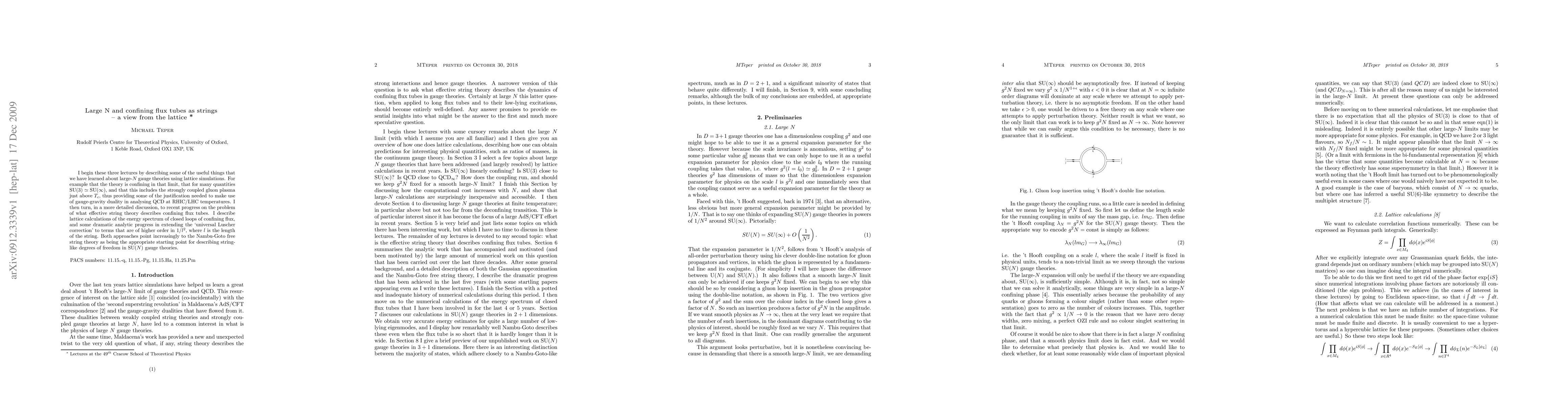 I begin these three lectures by describing some of the useful things that we have learned about large-N gauge theories using lattice simulations. For example that the theory is confining in that limit, that for many quantities SU(3) is close to SU(oo), and that this includes the strongly coupled gluon plasma just above Tc, thus providing some of the justification needed to make use of gauge-gravity duality in analysing QCD at RHIC/LHC temperatures. I then turn, in a more detailed discussion, to recent progress on the problem of what effective string theory describes confining flux tubes. I describe lattice calculations of the energy spectrum of closed loops of confining flux, and some dramatic analytic progress in extending the `universal Luscher correction' to terms that are of higher order in 1/l, where l is the length of the string. Both approaches point increasingly to the Nambu-Goto free string theory as being the appropriate starting point for describing string-like degrees of freedom in SU(N) gauge theories.