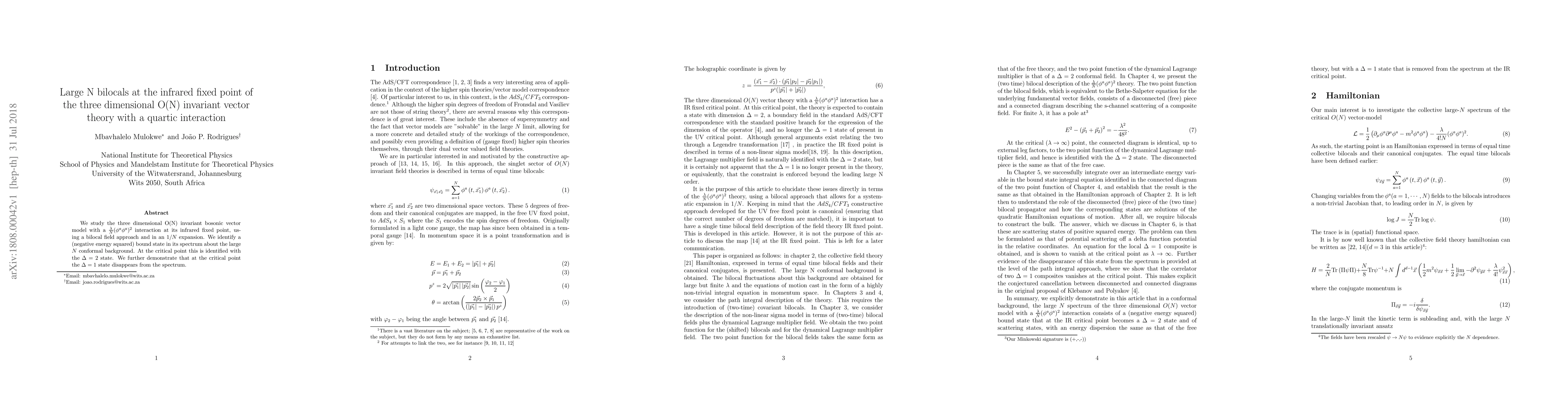 We study the three dimensional O(N) invariant bosonic vector model with a $\frac{\lambda}{N}(\phi^{a}\phi^{a})^{2}$ interaction at its infrared fixed point, using a bilocal field approach and in an $1/N$ expansion. We identify a (negative energy squared) bound state in its spectrum about the large $N$ conformal background. At the critical point this is identified with the $\Delta=2$ state. We further demonstrate that at the critical point the $\Delta=1$ state disappears from the spectrum.