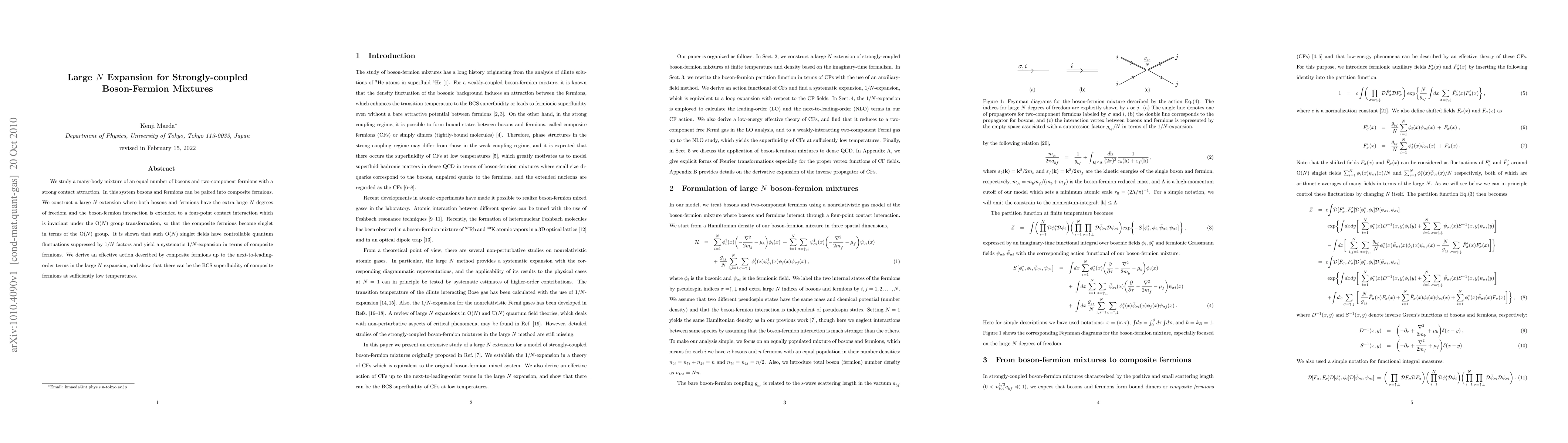 We study a many-body mixture of an equal number of bosons and two-component fermions with a strong contact attraction. In this system bosons and fermions can be paired into composite fermions. We construct a large N extension where both bosons and fermions have the extra large N degrees of freedom and the boson-fermion interaction is extended to a four-point contact interaction which is invariant under the O(N) group transformation, so that the composite fermions become singlet in terms of the O(N) group. It is shown that such O(N) singlet fields have controllable quantum fluctuations suppressed by 1/N factors and yield a systematic 1/N-expansion in terms of composite fermions. We derive an effective action described by composite fermions up to the next-to-leading-order terms in the large N expansion, and show that there can be the BCS superfluidity of composite fermions at sufficiently low temperatures.