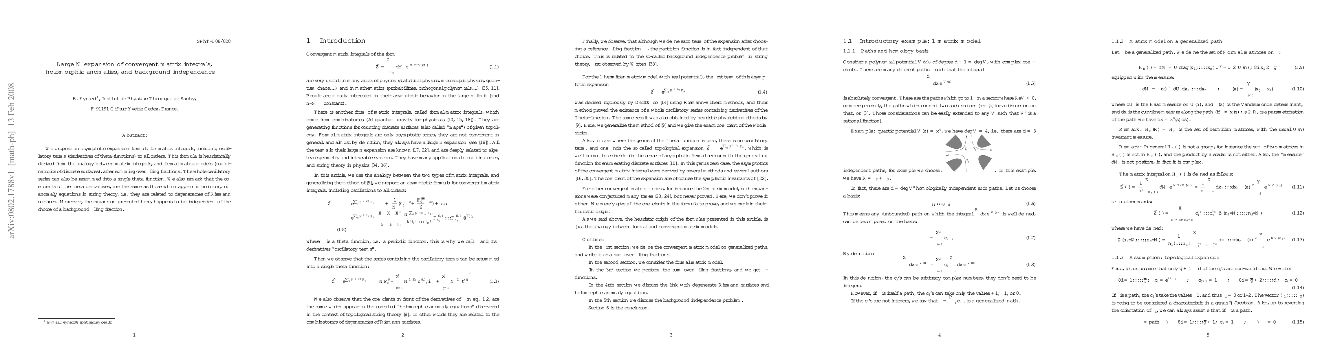 The paper proposes an asymptotic expansion for matrix integrals using oscillatory terms, derived via analogy with formal matrix models, which connects to holomorphic anomalies in string theory and demonstrates background independence. The expansion resums into a single theta function, with coefficients tied to Riemann surface degeneracies.