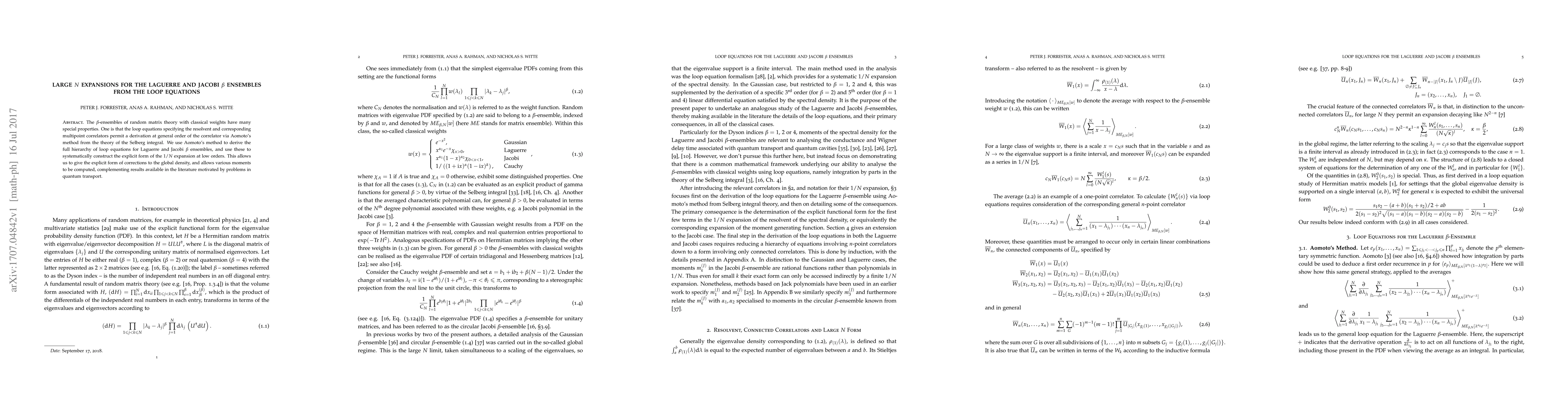 This paper employs Aomoto's method to derive loop equations for Laguerre and Jacobi $\beta$ ensembles, facilitating the construction of $1/N$ expansions. The study provides explicit corrections to the global density and computes various moments, enriching existing research on quantum transport.