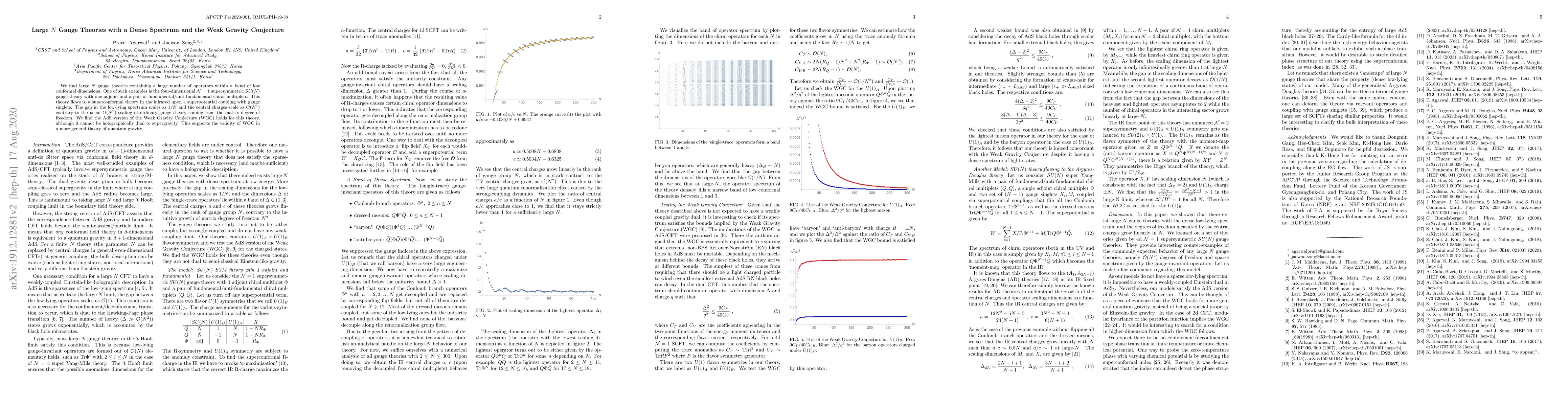 This paper investigates large N gauge theories with a dense spectrum of low conformal dimensions, exemplified by a four-dimensional N=1 supersymmetric SU(N) gauge theory. It finds that the gap scales as 1/N and central charges as O(N), differing from typical gauge theories. The AdS version of the Weak Gravity Conjecture holds, supporting the conjecture's validity beyond supergravity.
