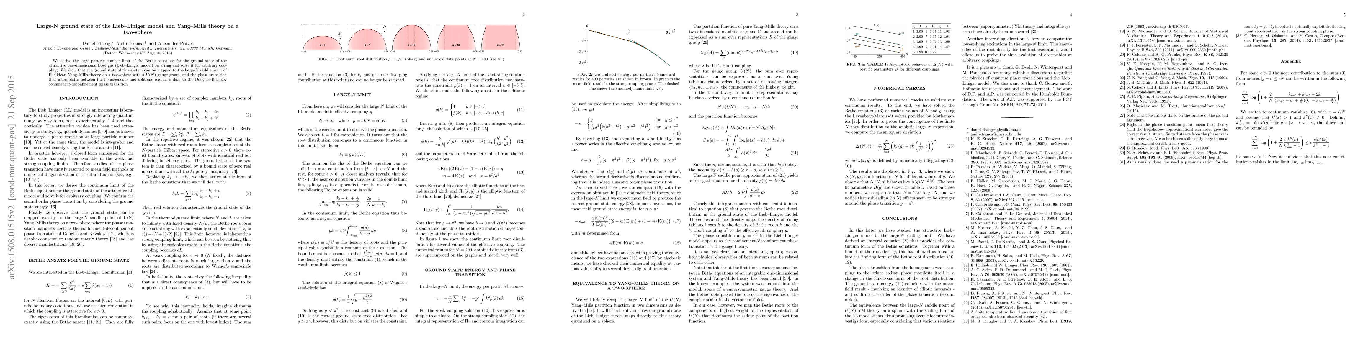 This paper derives the large particle number limit of the Lieb-Liniger model's Bethe equations and maps its ground state to the large-N saddle point of Euclidean Yang-Mills theory on a two-sphere, revealing a dual relationship with the Douglas-Kazakov confinement-deconfinement phase transition.